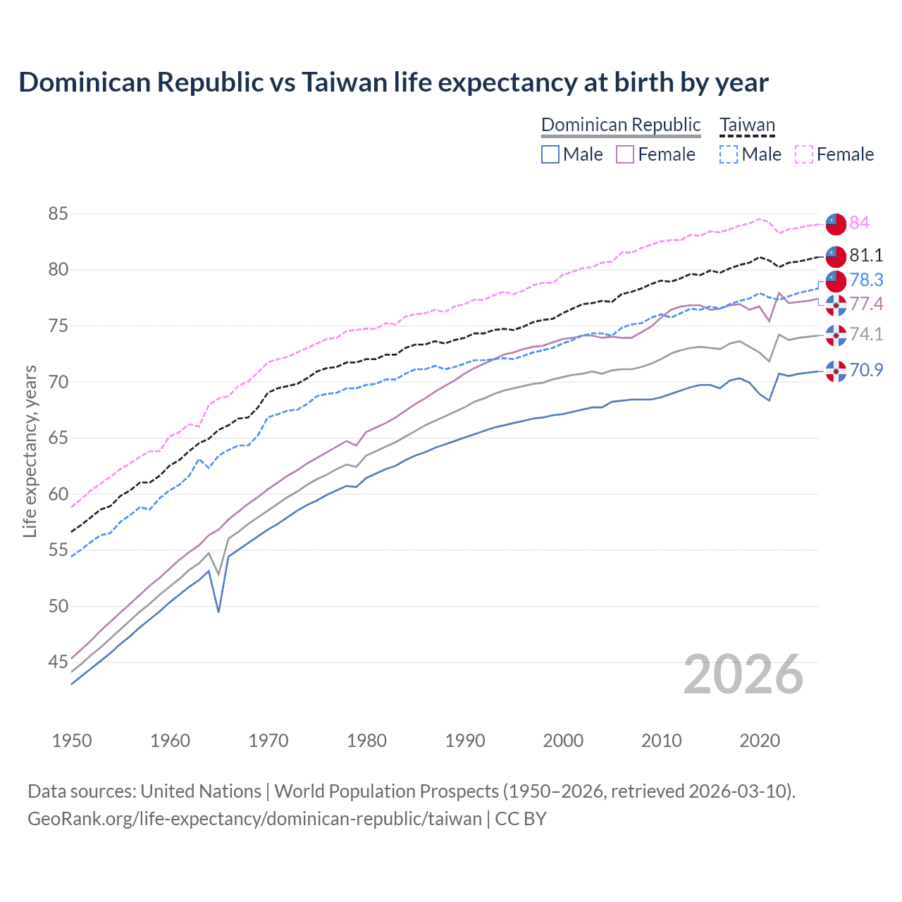 The average life expectancy at birth is 74.1 years in the Dominican Republic vs 81.1 in Taiwan. The Dominican Republic is ranked 101/197 by life expectancy, and Taiwan is 40/197. In the Dominican Republic, the life expectancy is 70.9 years for males and 77.4 years for females. In Taiwan, it's 78.3 years for males and 84 years for females.