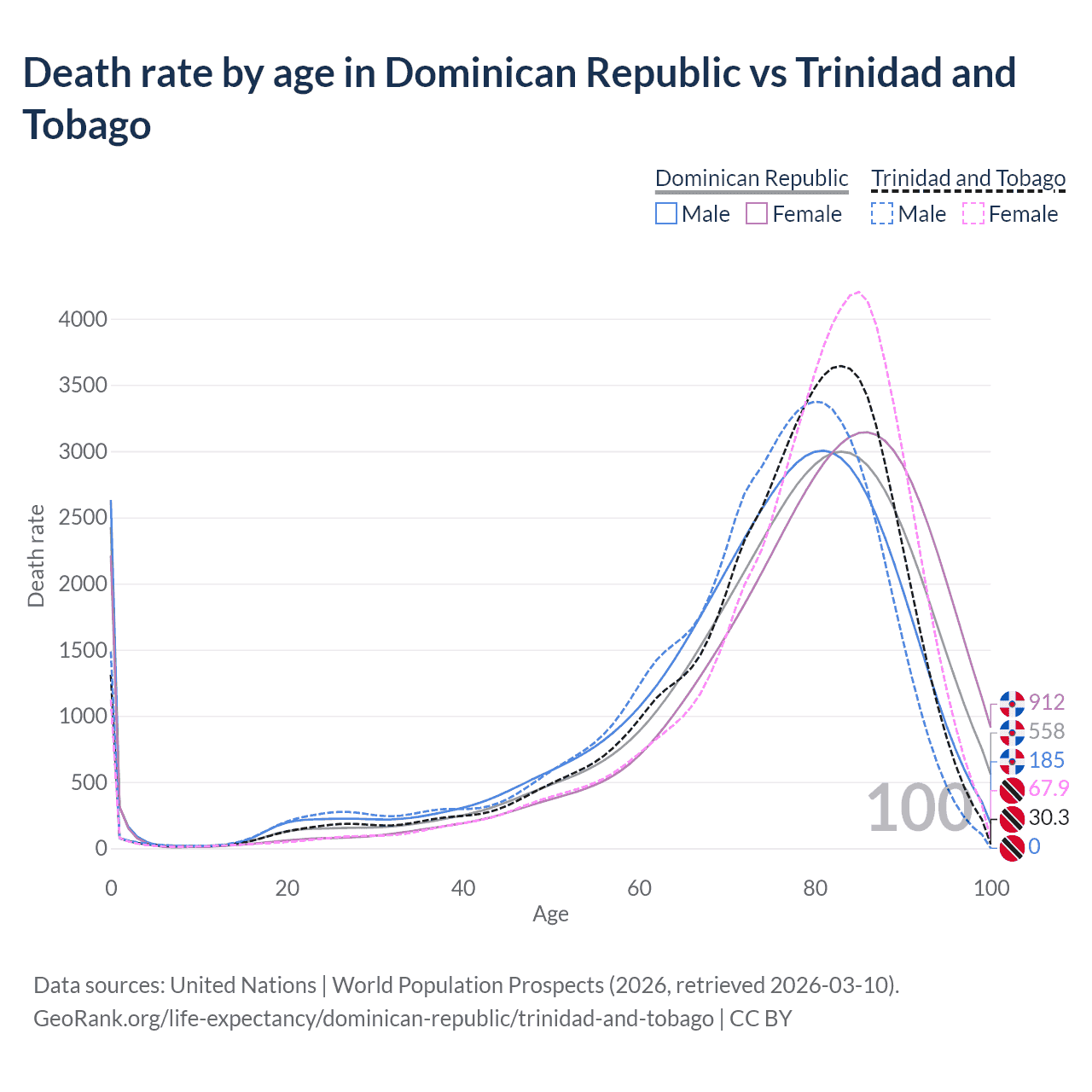 In the Dominican Republic, the most common age of death is 83, compared to 83 in Trinidad and Tobago. The median age of death is 78.9 in the Dominican Republic and 78.4 in Trinidad and Tobago, meaning only half of each cohort is expected to live past that age.