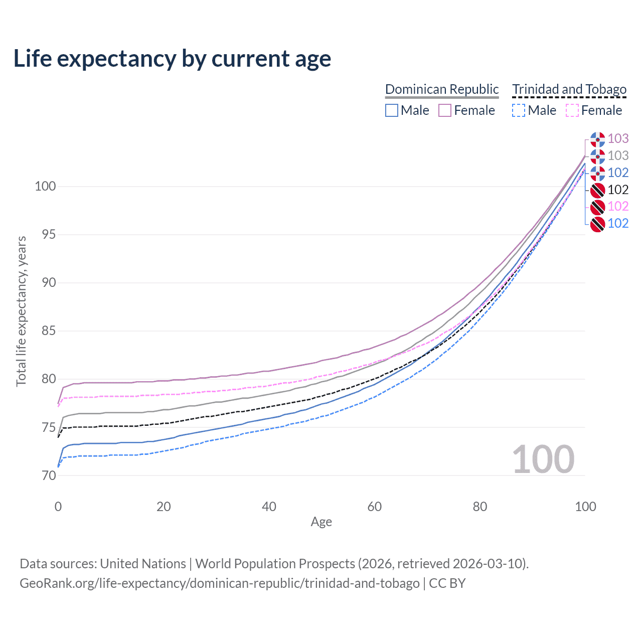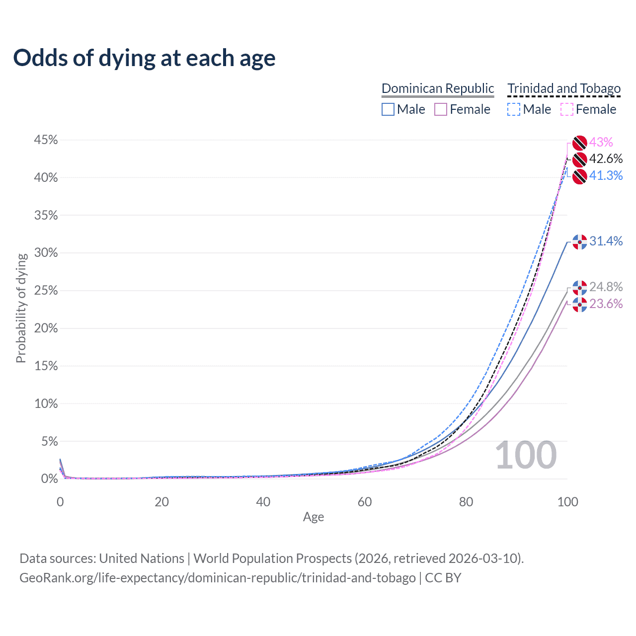 This life expectancy calculator shows the odds of living to 100, 95, 90, and below based on current age for both males and females in the Dominican Republic and Trinidad and Tobago, along with mean and median age of death. The calculations are based on the 2026 life tables (actuarial tables) from the UN World Population Prospects.