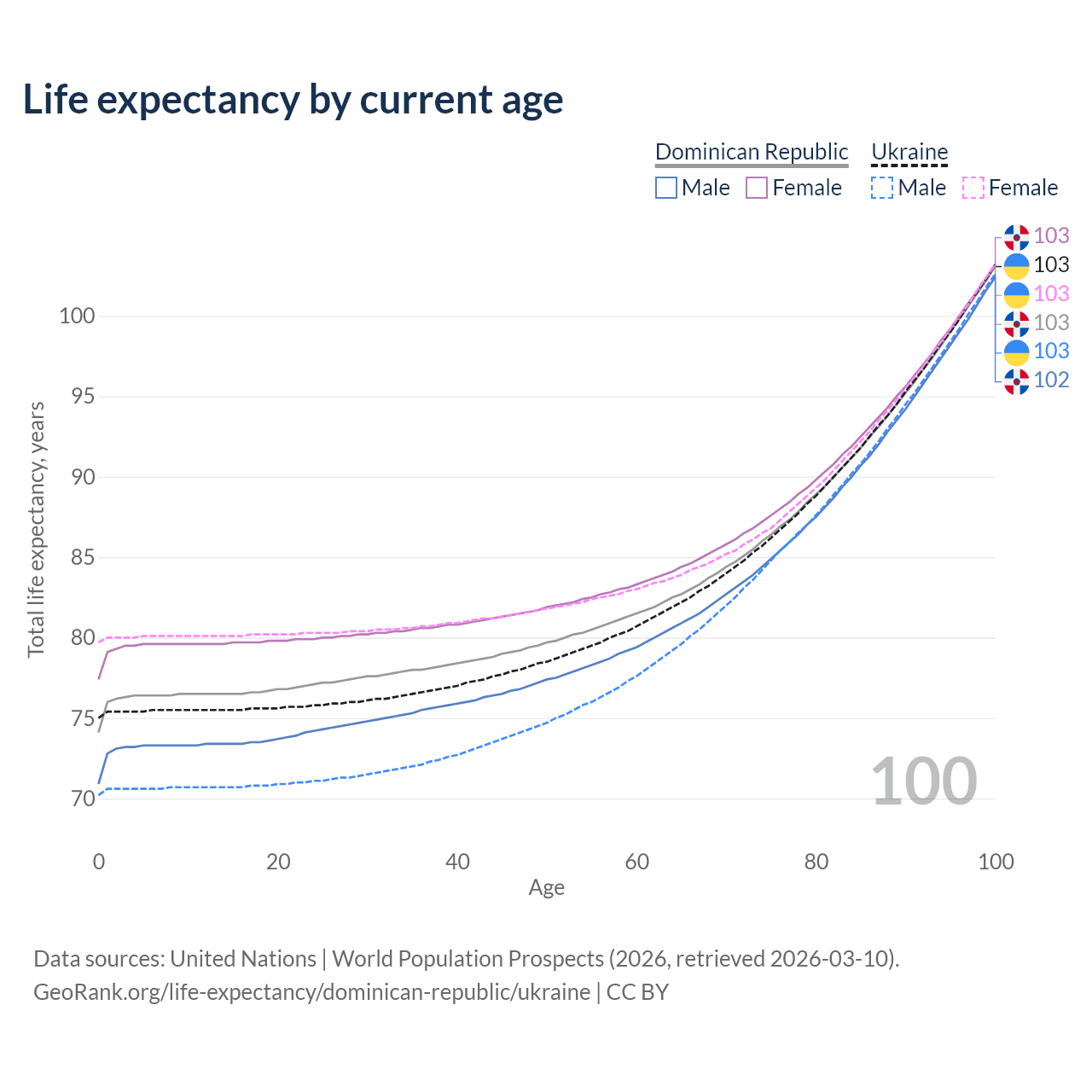 This life expectancy calculator shows the odds of living to 100, 95, 90, and below based on current age for both males and females in the Dominican Republic and Ukraine, along with mean and median age of death. The calculations are based on the 2026 life tables (actuarial tables) from the UN World Population Prospects.