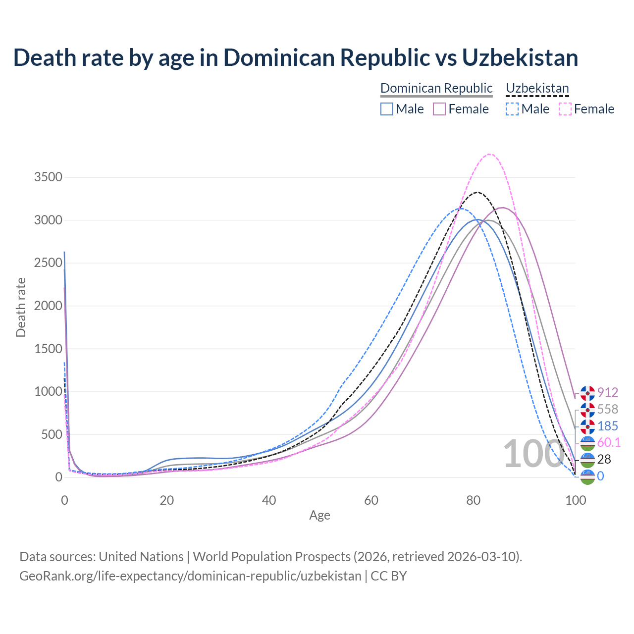 In the Dominican Republic, the most common age of death is 83, compared to 81 in Uzbekistan. The median age of death is 78.9 in the Dominican Republic and 76.4 in Uzbekistan, meaning only half of each cohort is expected to live past that age.