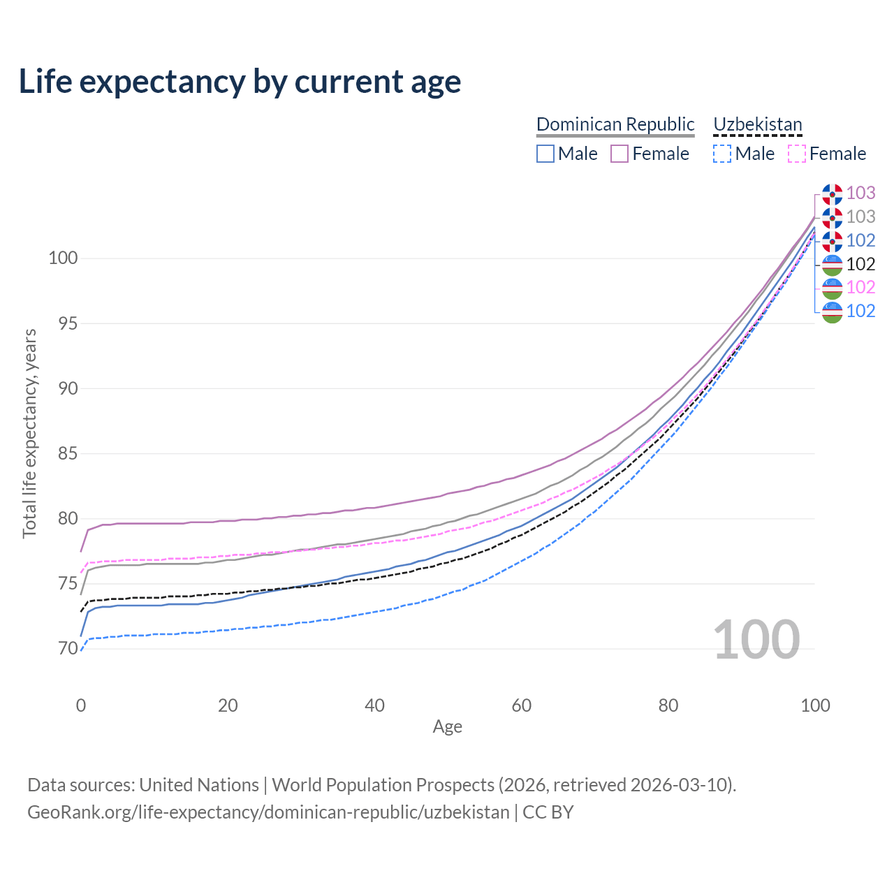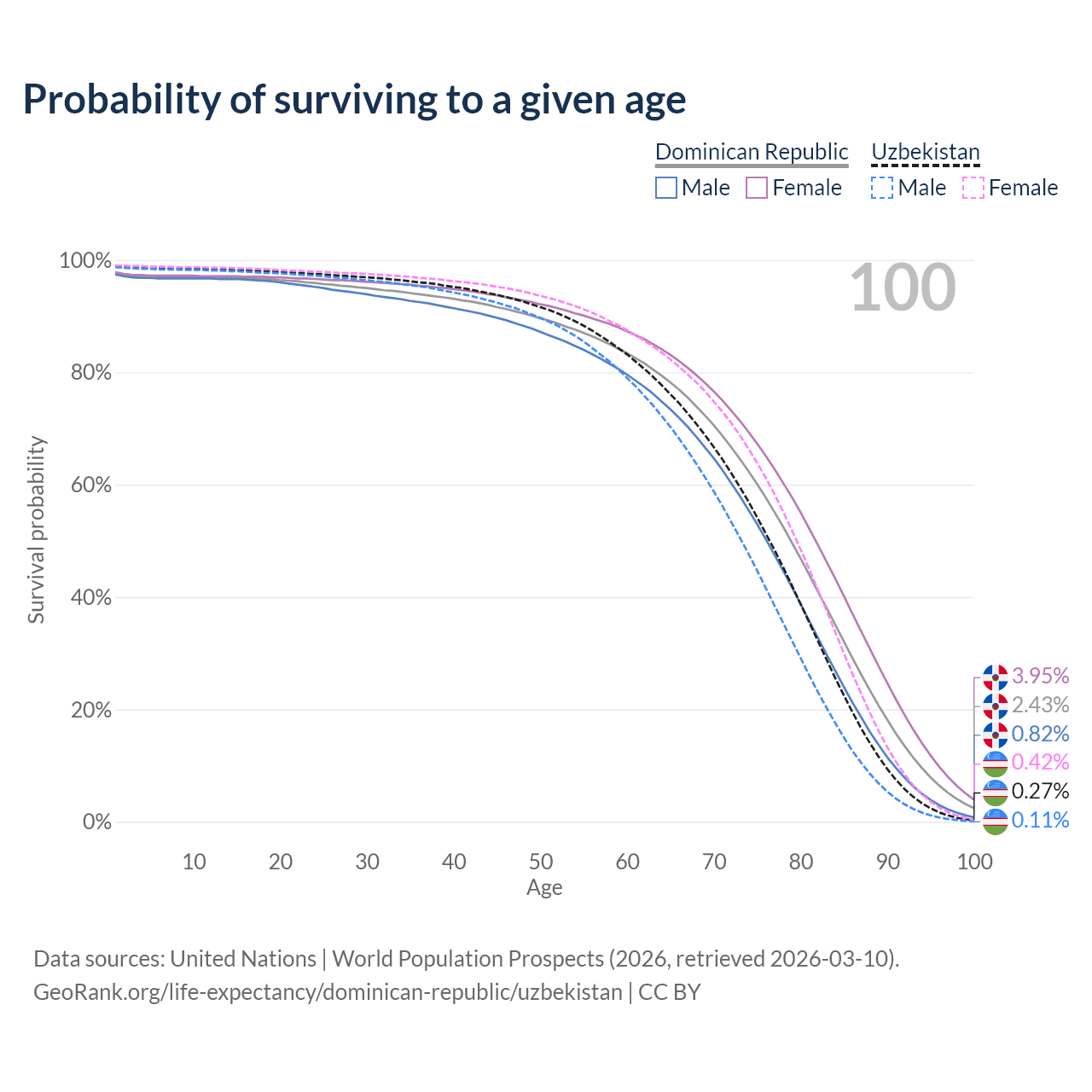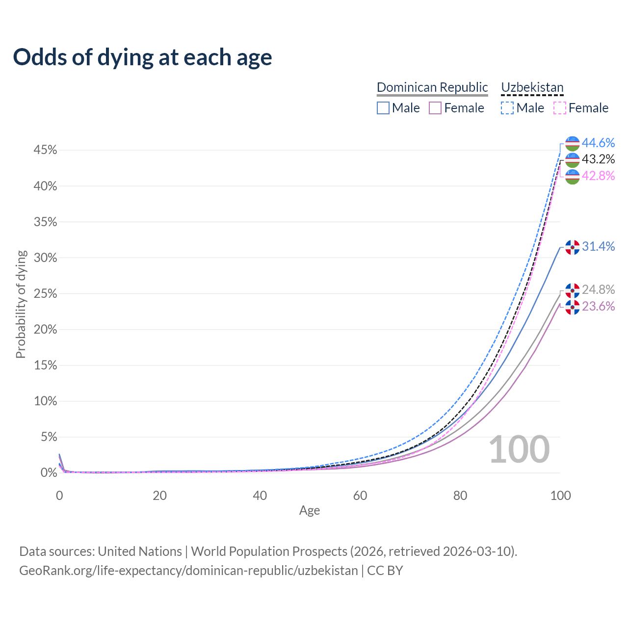 This life expectancy calculator shows the odds of living to 100, 95, 90, and below based on current age for both males and females in the Dominican Republic and Uzbekistan, along with mean and median age of death. The calculations are based on the 2026 life tables (actuarial tables) from the UN World Population Prospects.