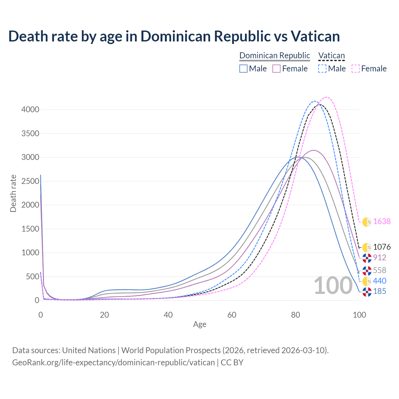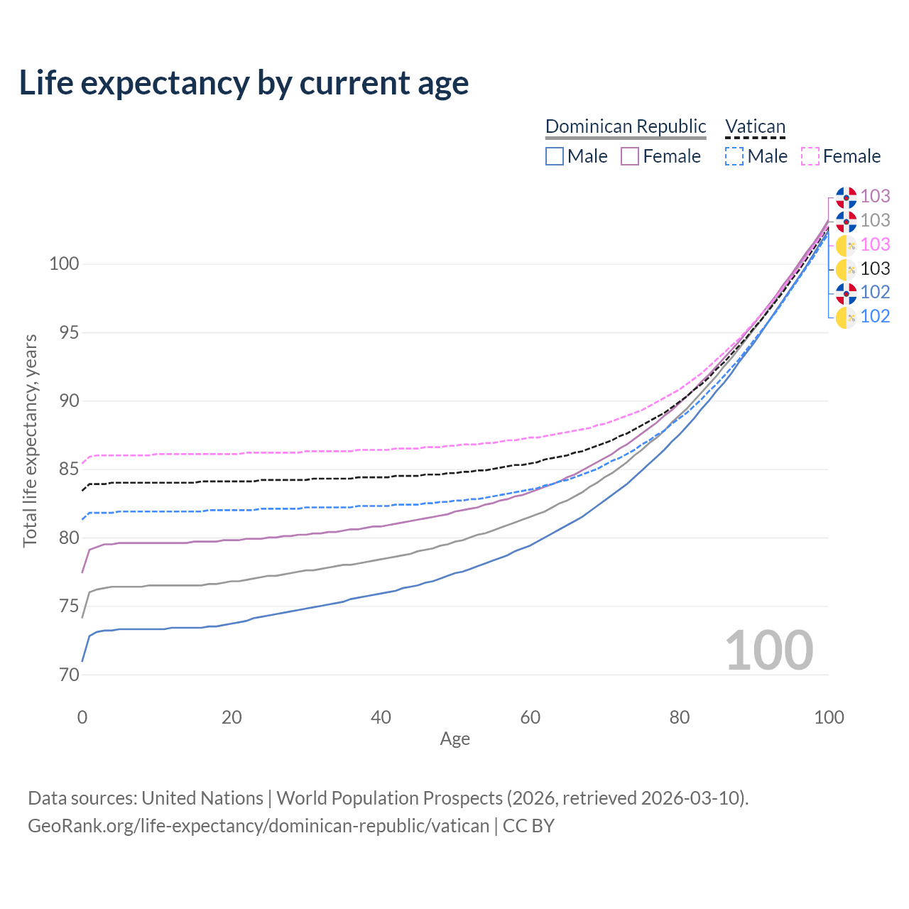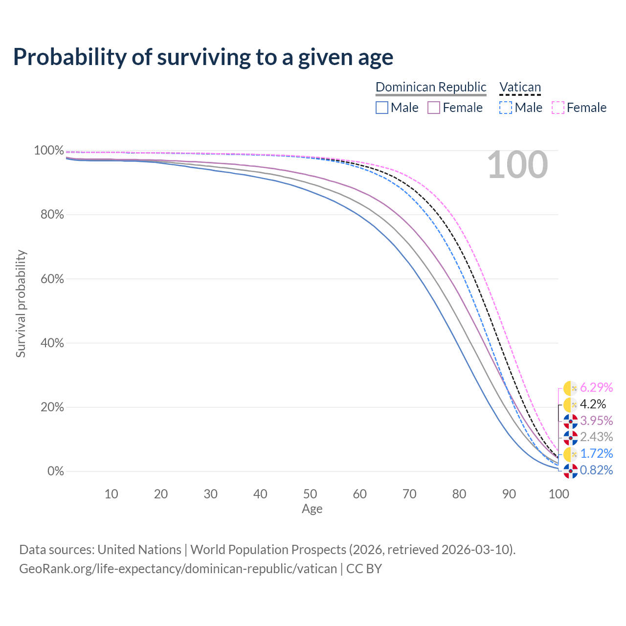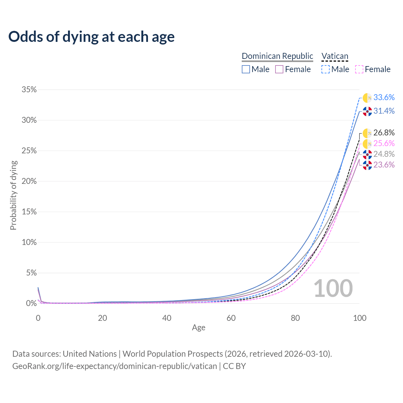 This life expectancy calculator shows the odds of living to 100, 95, 90, and below based on current age for both males and females in the Dominican Republic and the Vatican, along with mean and median age of death. The calculations are based on the 2026 life tables (actuarial tables) from the UN World Population Prospects.