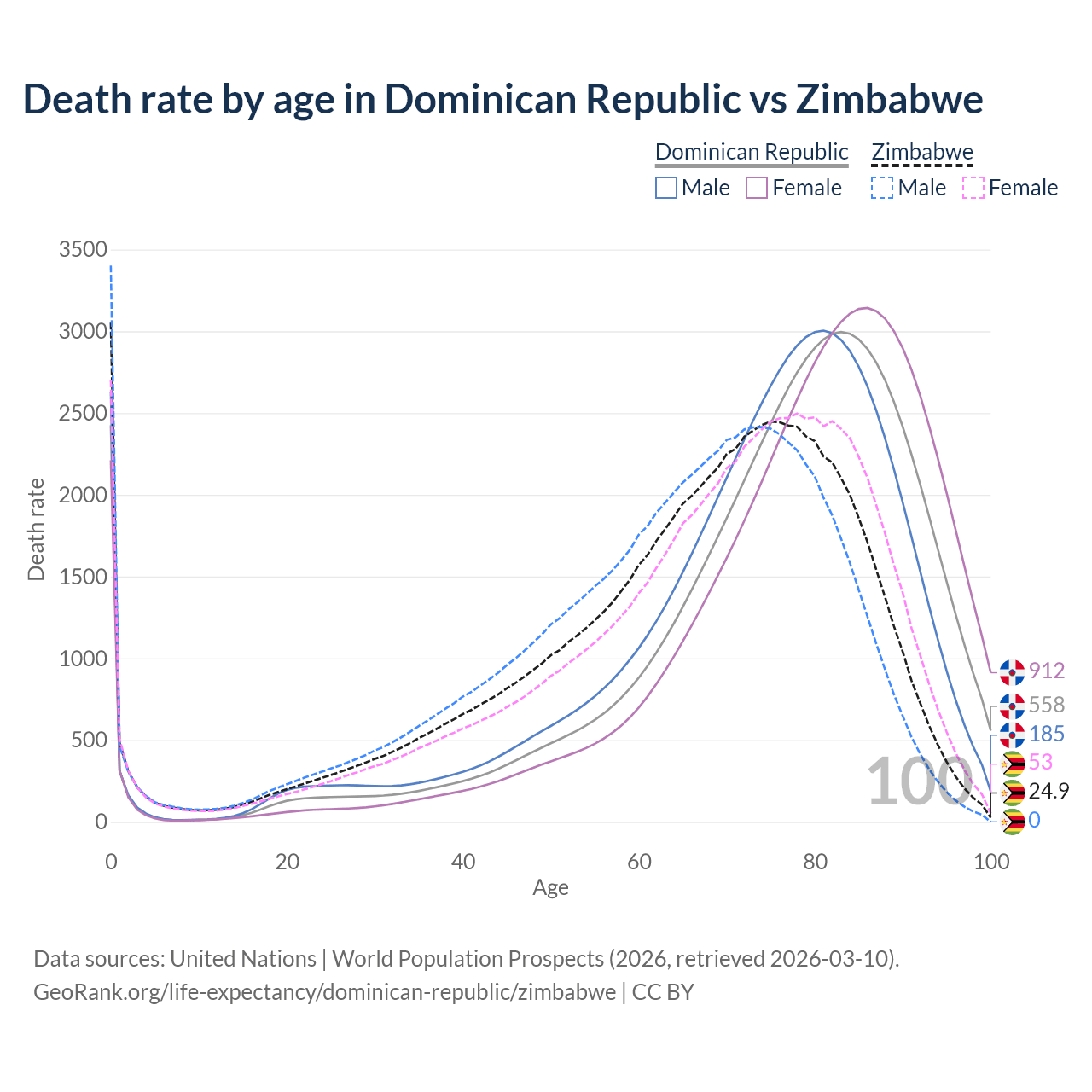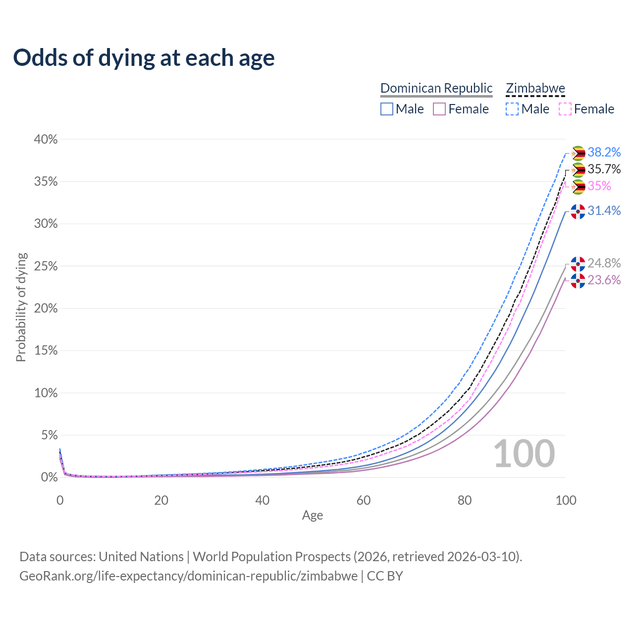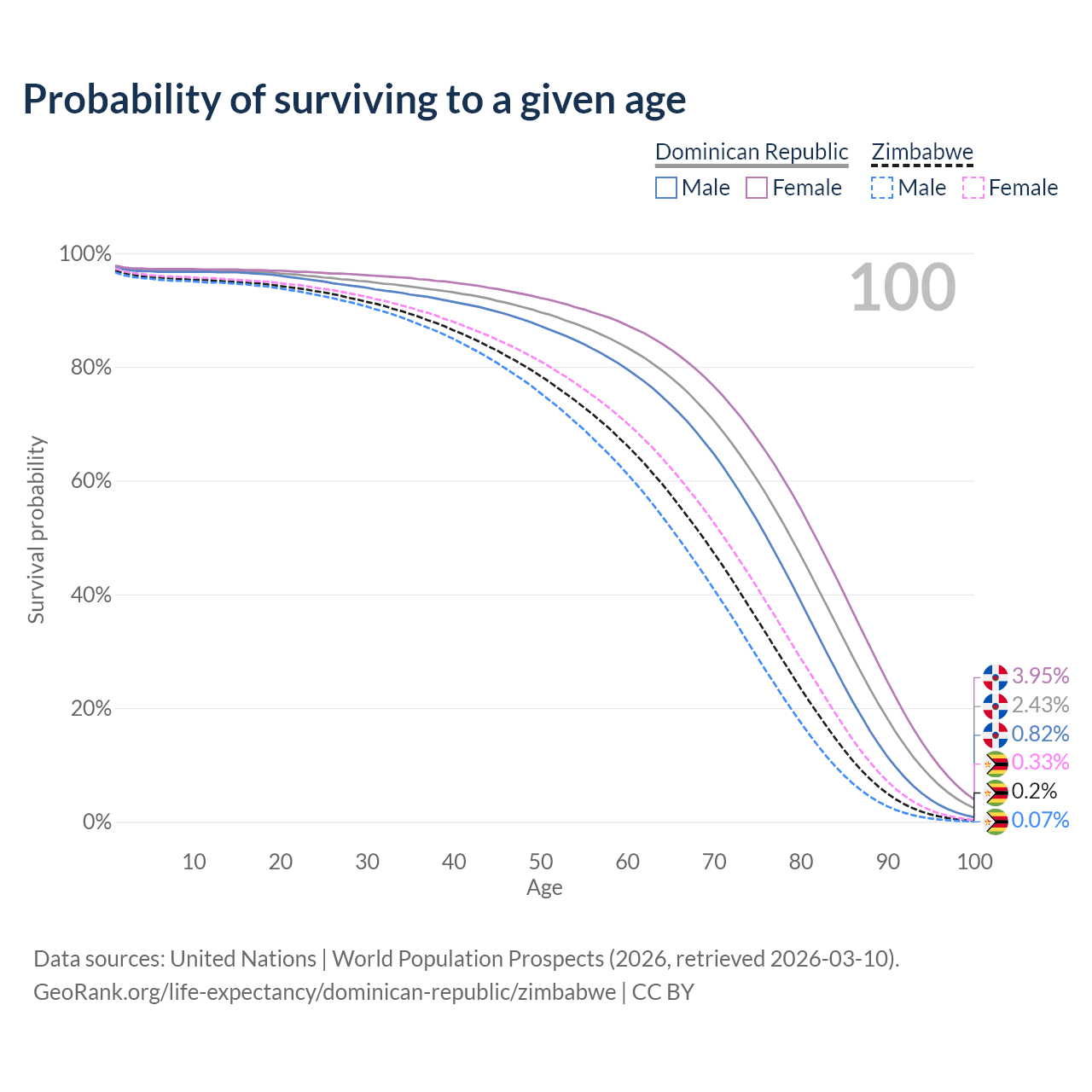 This life expectancy calculator shows the odds of living to 100, 95, 90, and below based on current age for both males and females in the Dominican Republic and Zimbabwe, along with mean and median age of death. The calculations are based on the 2026 life tables (actuarial tables) from the UN World Population Prospects.