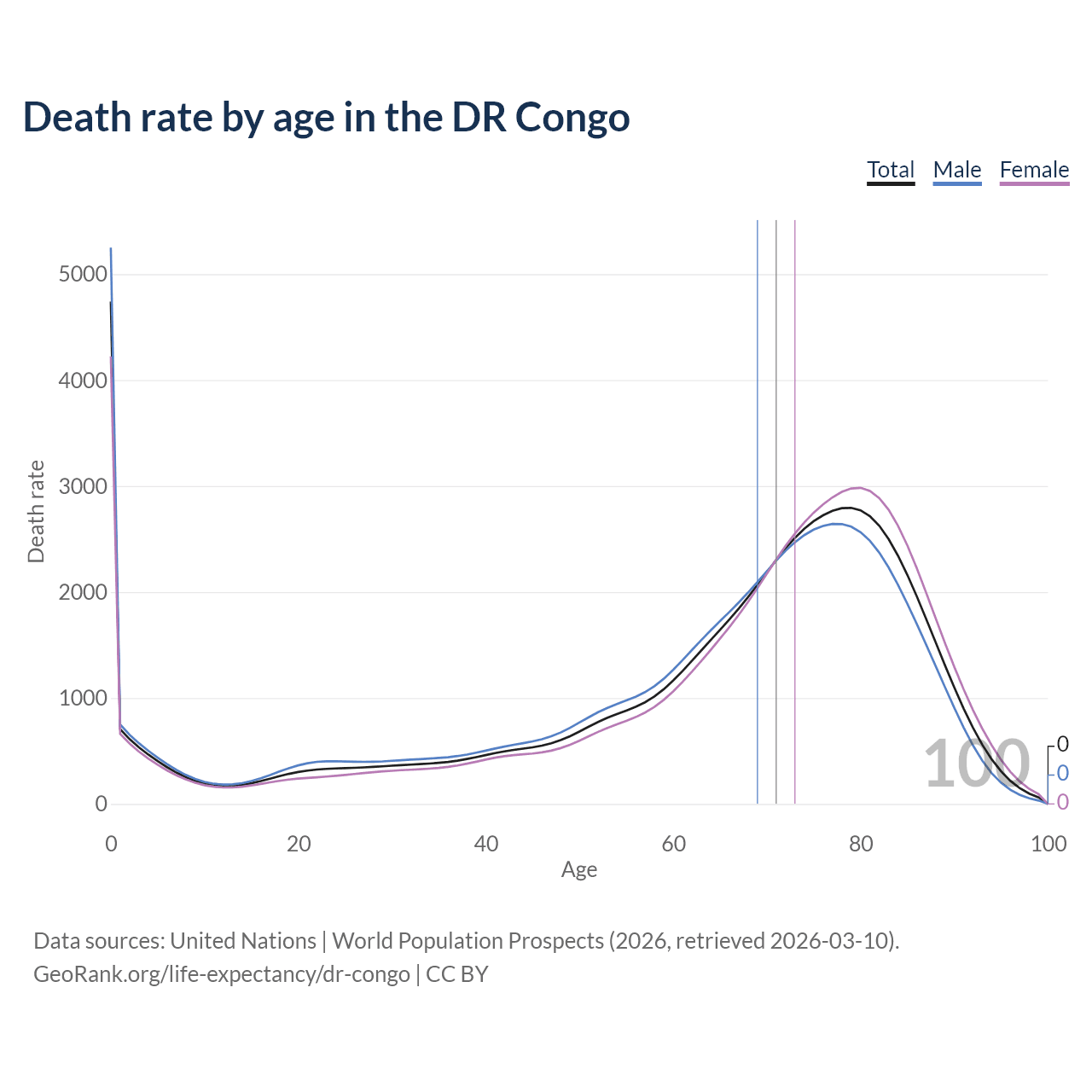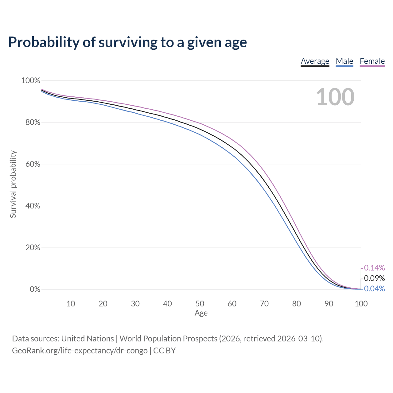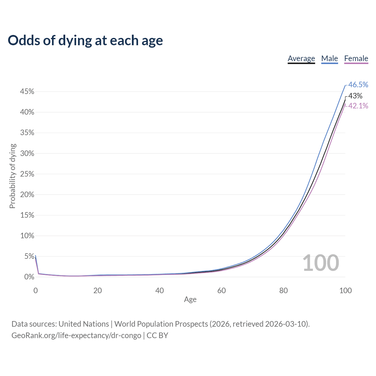 This life expectancy calculator shows the odds of living to 100, 95, 90, and below based on current age for both males and females in the DR Congo, along with mean and median age of death. The calculations are based on the 2026 life tables (actuarial tables) from the UN World Population Prospects.