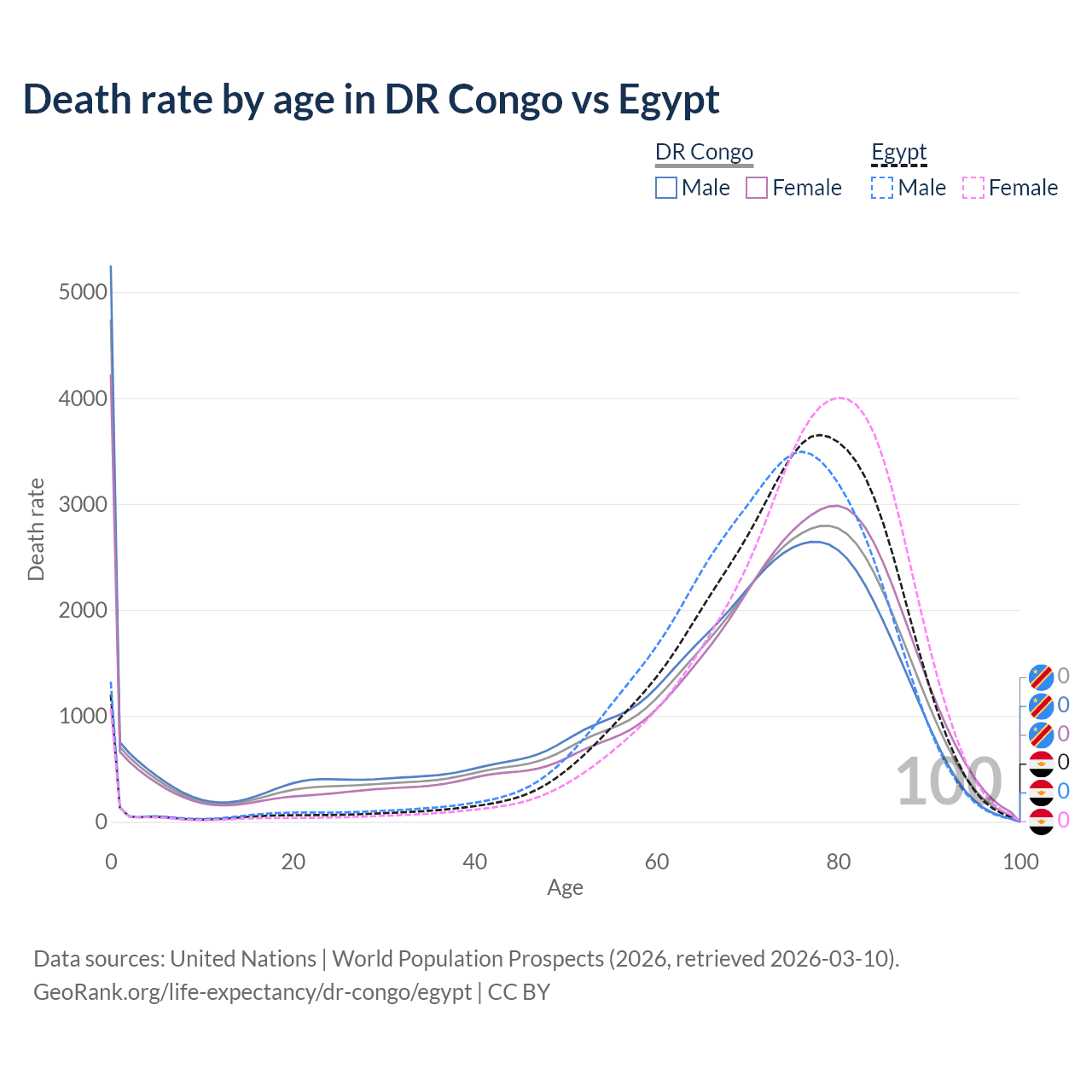 In the DR Congo, the most common age of death is 0, compared to 78 in Egypt. The median age of death is 70.9 in the DR Congo and 75.2 in Egypt, meaning only half of each cohort is expected to live past that age.