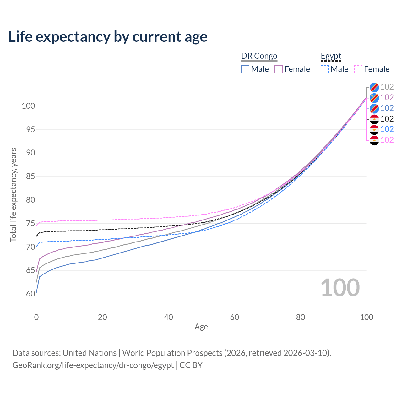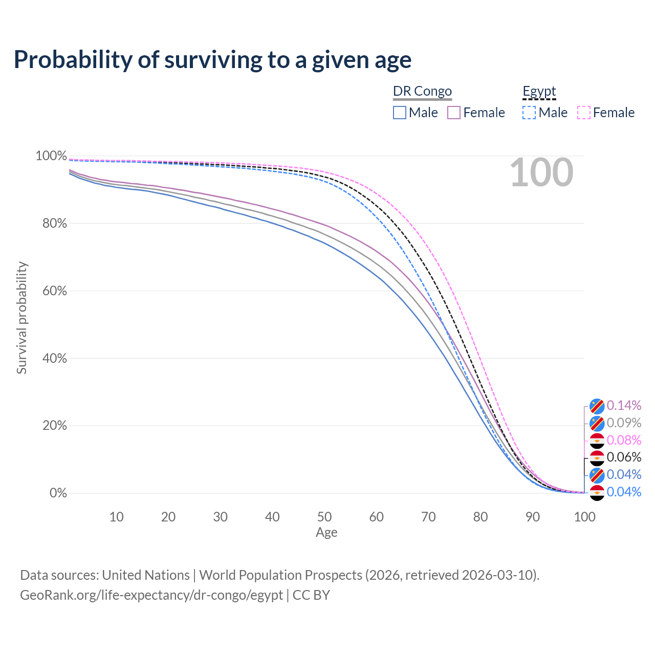 This life expectancy calculator shows the odds of living to 100, 95, 90, and below based on current age for both males and females in the DR Congo and Egypt, along with mean and median age of death. The calculations are based on the 2026 life tables (actuarial tables) from the UN World Population Prospects.
