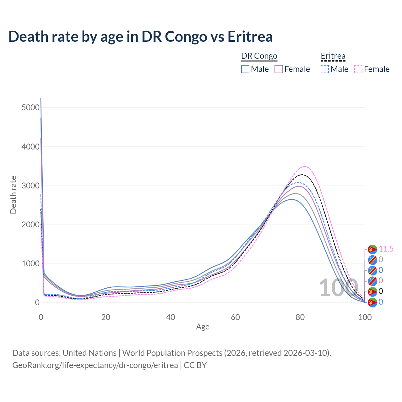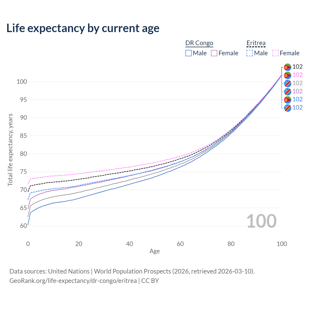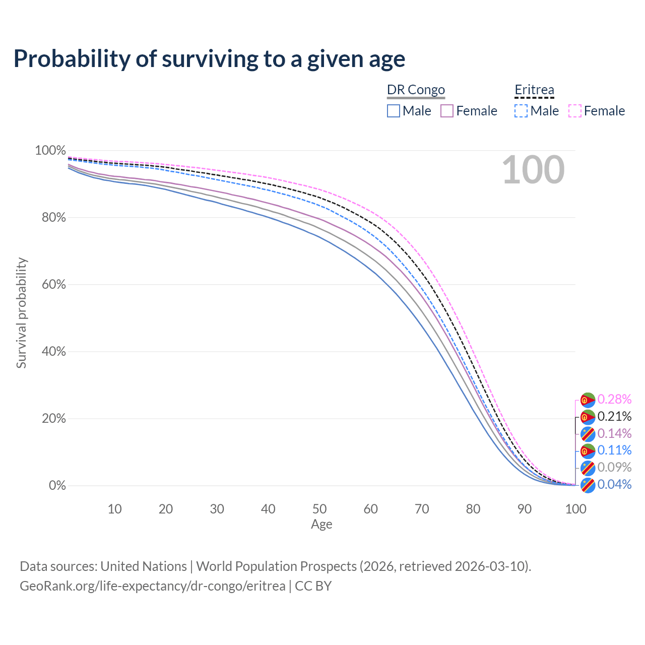 This life expectancy calculator shows the odds of living to 100, 95, 90, and below based on current age for both males and females in the DR Congo and Eritrea, along with mean and median age of death. The calculations are based on the 2026 life tables (actuarial tables) from the UN World Population Prospects.