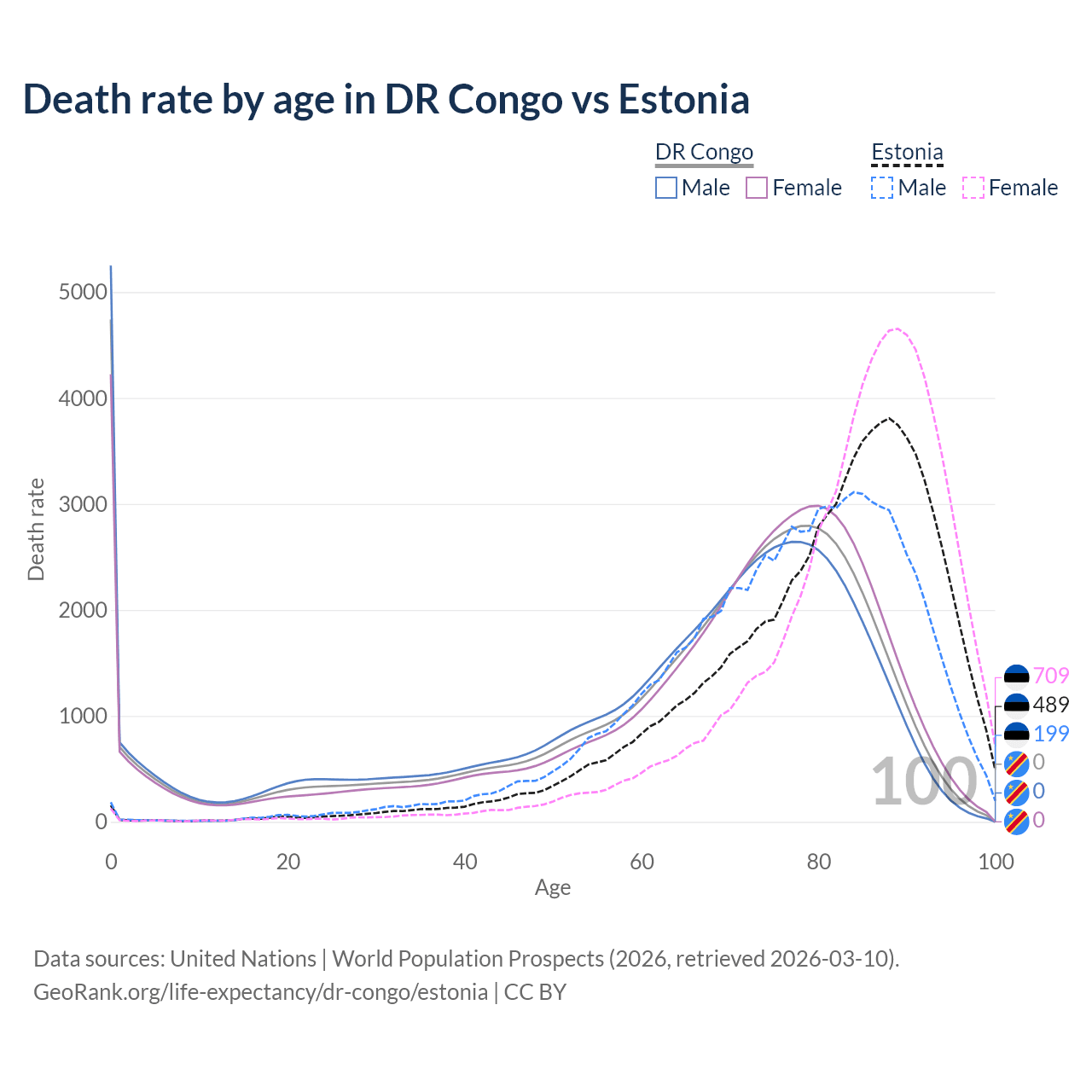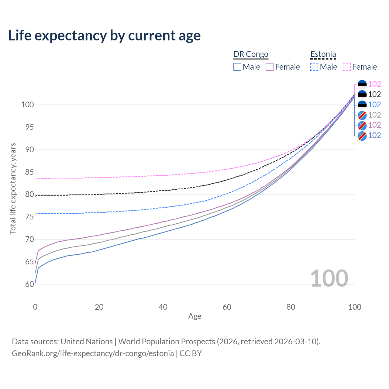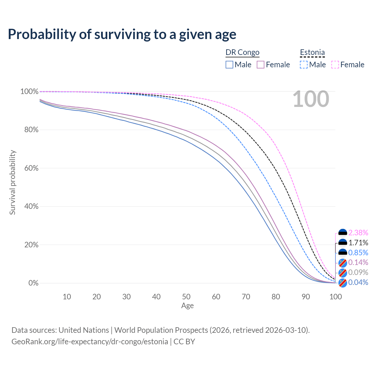 This life expectancy calculator shows the odds of living to 100, 95, 90, and below based on current age for both males and females in the DR Congo and Estonia, along with mean and median age of death. The calculations are based on the 2026 life tables (actuarial tables) from the UN World Population Prospects.