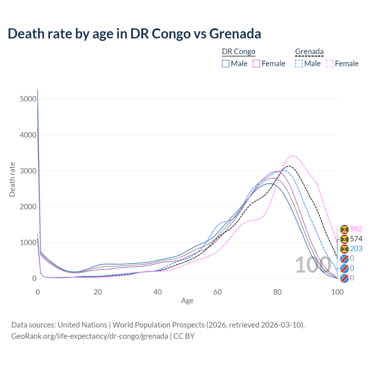 In the DR Congo, the most common age of death is 0, compared to 84 in Grenada. The median age of death is 70.9 in the DR Congo and 79.3 in Grenada, meaning only half of each cohort is expected to live past that age.