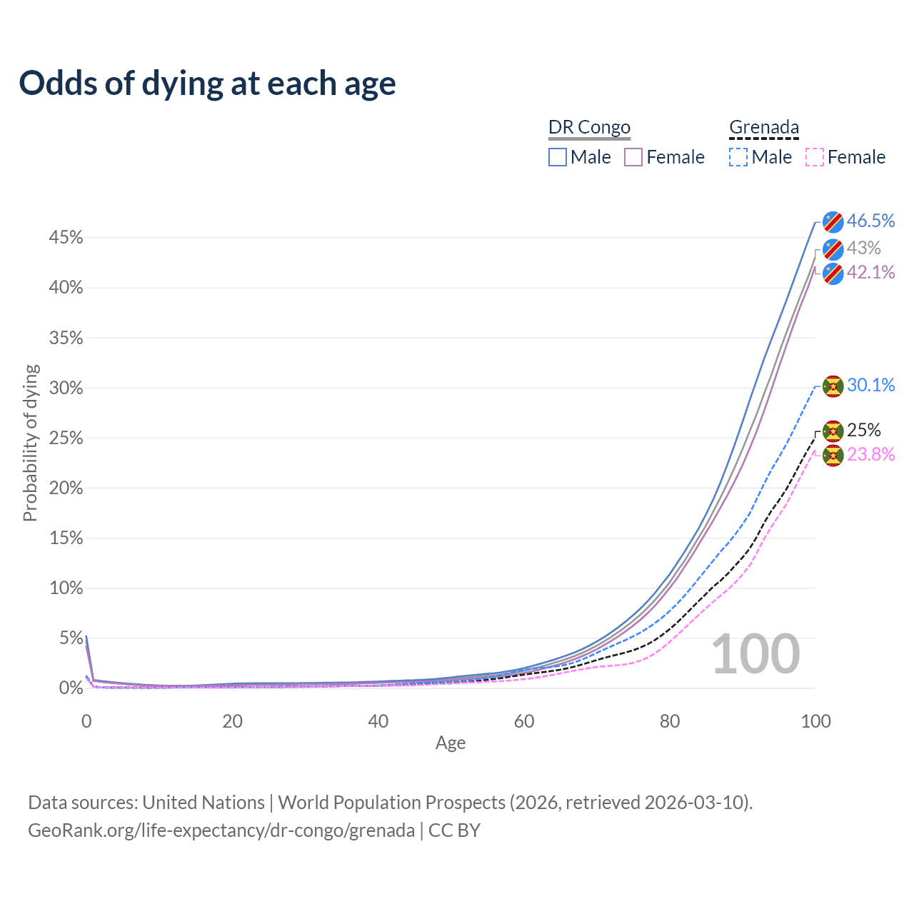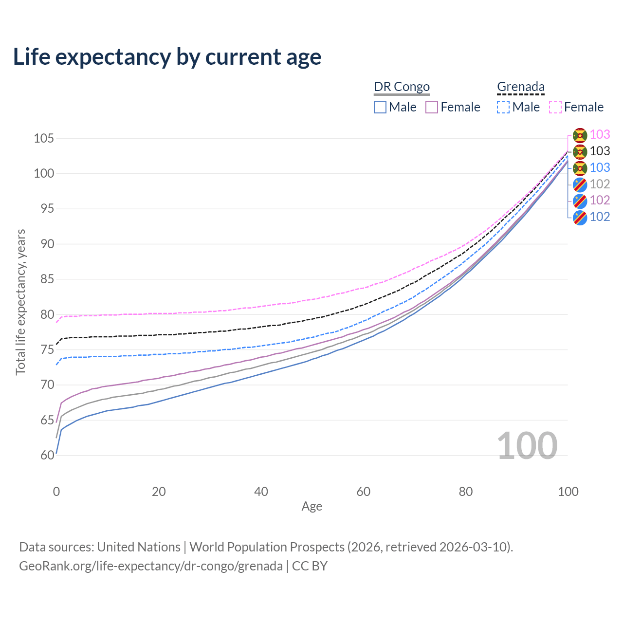 This life expectancy calculator shows the odds of living to 100, 95, 90, and below based on current age for both males and females in the DR Congo and Grenada, along with mean and median age of death. The calculations are based on the 2026 life tables (actuarial tables) from the UN World Population Prospects.