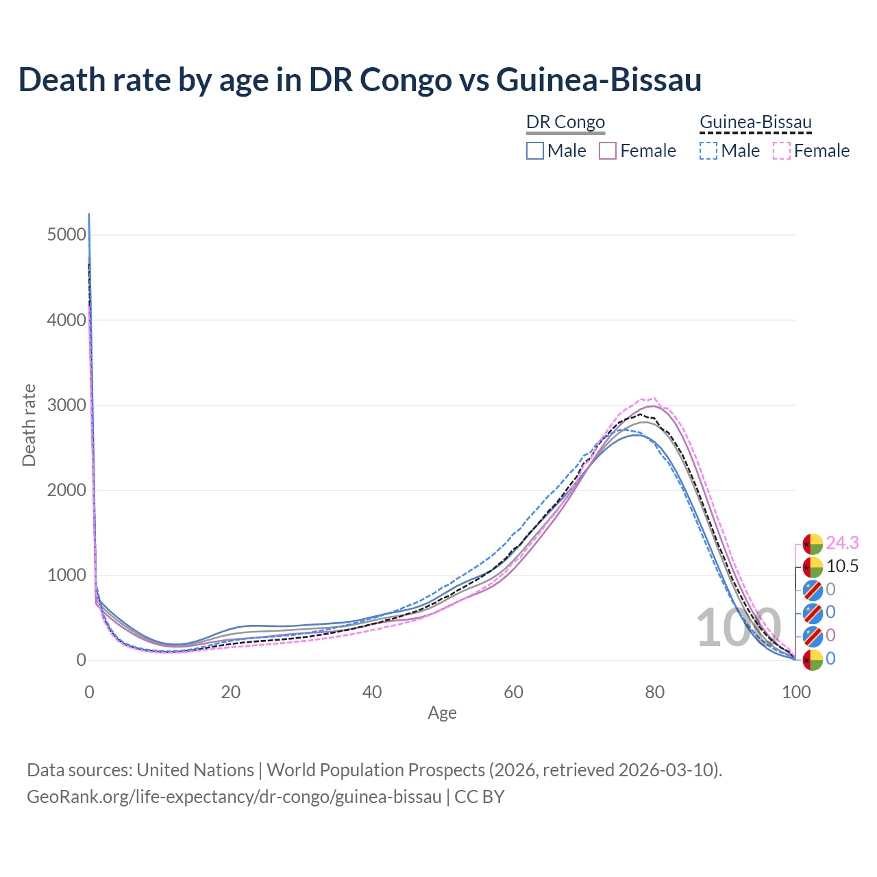 In the DR Congo, the most common age of death is 0, compared to 0 in Guinea-Bissau. The median age of death is 70.9 in the DR Congo and 71.8 in Guinea-Bissau, meaning only half of each cohort is expected to live past that age.