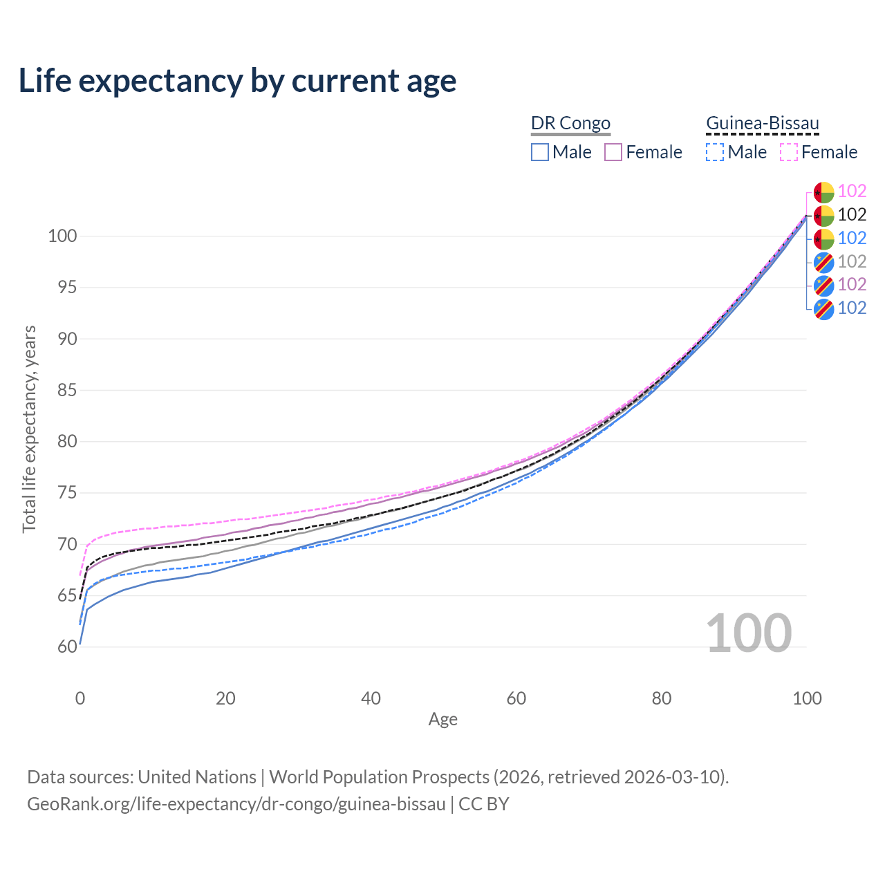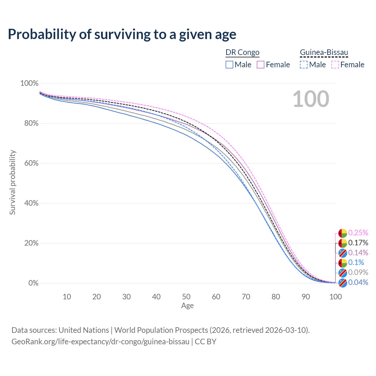 This life expectancy calculator shows the odds of living to 100, 95, 90, and below based on current age for both males and females in the DR Congo and Guinea-Bissau, along with mean and median age of death. The calculations are based on the 2026 life tables (actuarial tables) from the UN World Population Prospects.