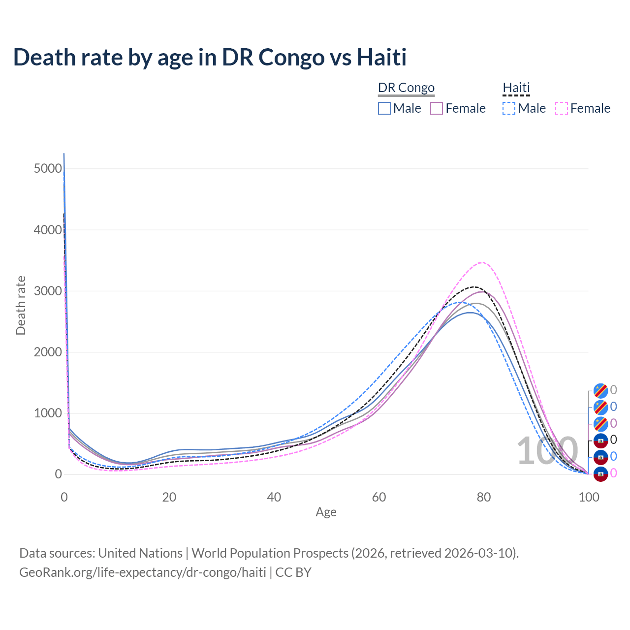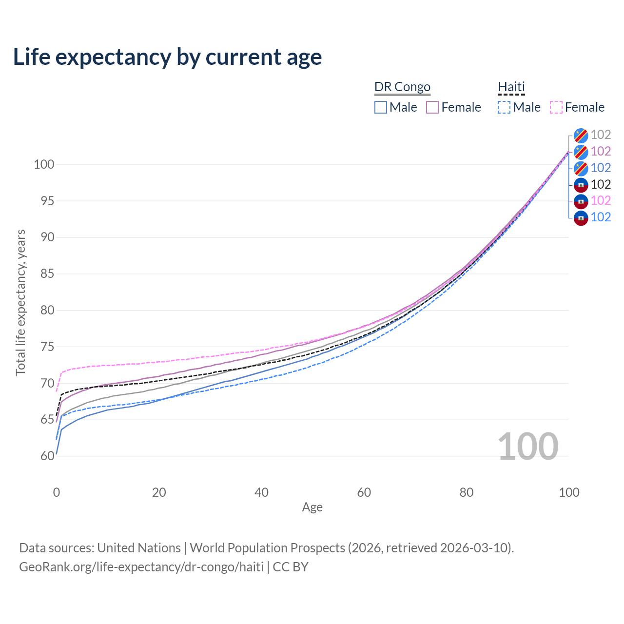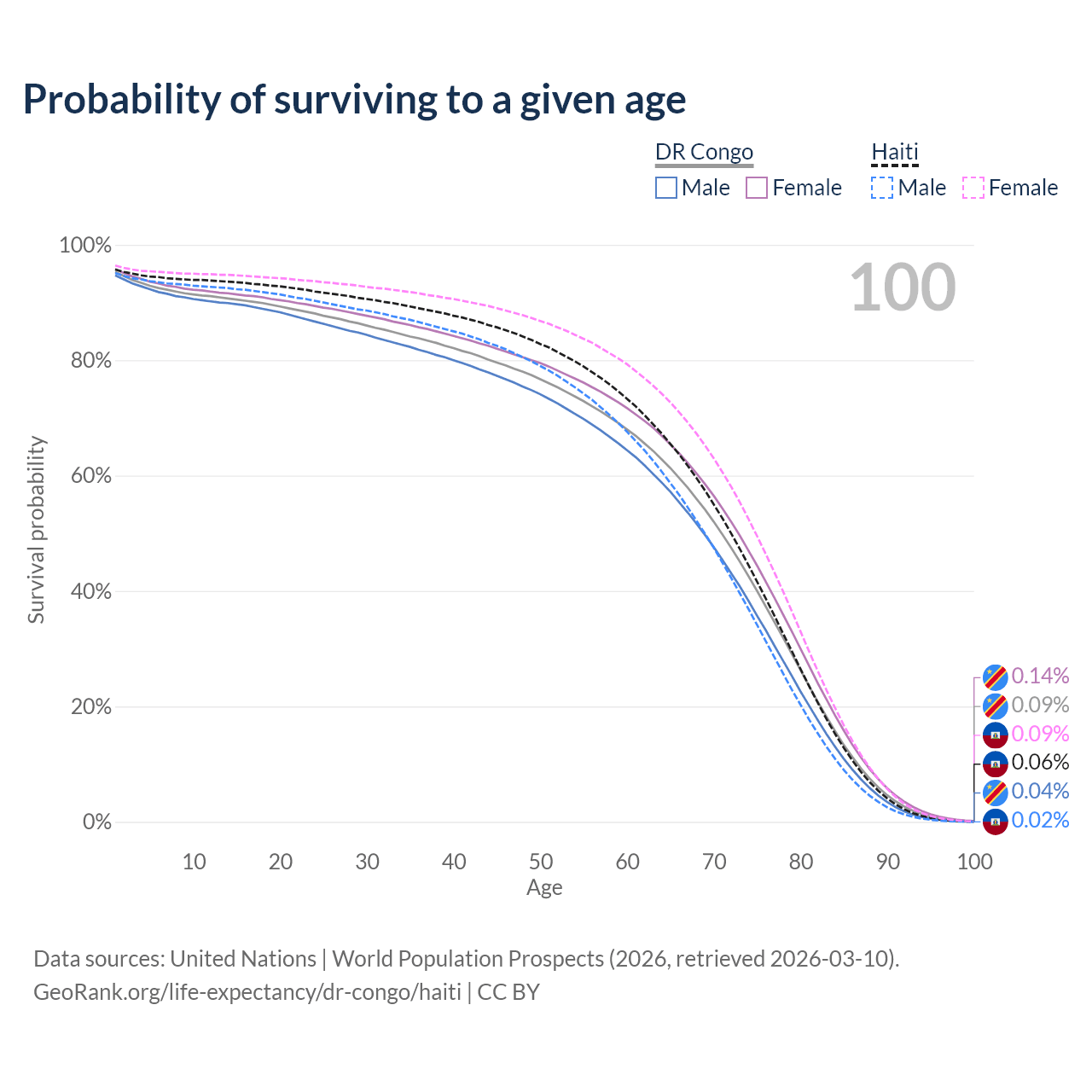 This life expectancy calculator shows the odds of living to 100, 95, 90, and below based on current age for both males and females in the DR Congo and Haiti, along with mean and median age of death. The calculations are based on the 2026 life tables (actuarial tables) from the UN World Population Prospects.
