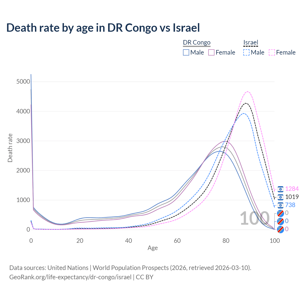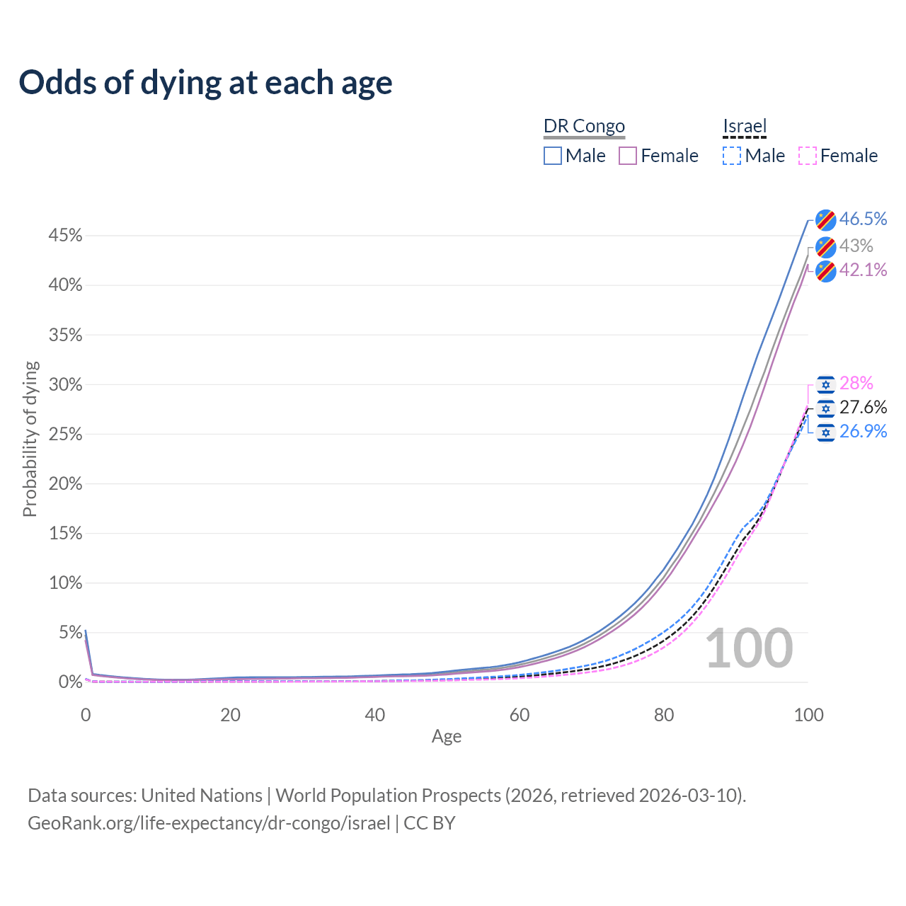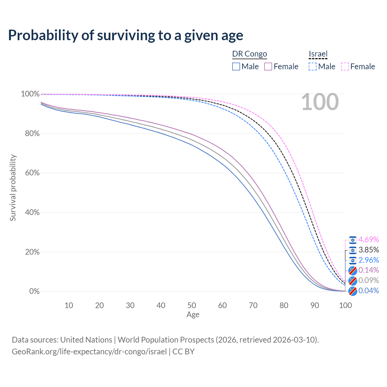 This life expectancy calculator shows the odds of living to 100, 95, 90, and below based on current age for both males and females in the DR Congo and Israel, along with mean and median age of death. The calculations are based on the 2026 life tables (actuarial tables) from the UN World Population Prospects.