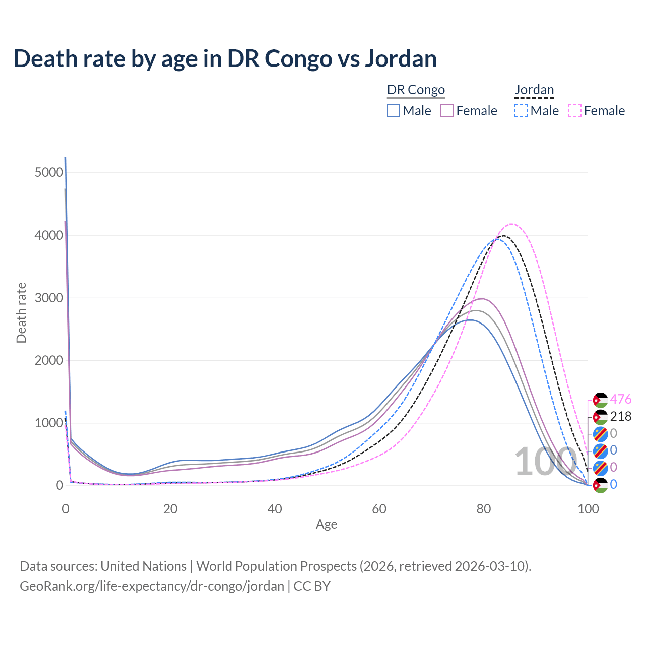 In the DR Congo, the most common age of death is 0, compared to 84 in Jordan. The median age of death is 70.9 in the DR Congo and 81.3 in Jordan, meaning only half of each cohort is expected to live past that age.