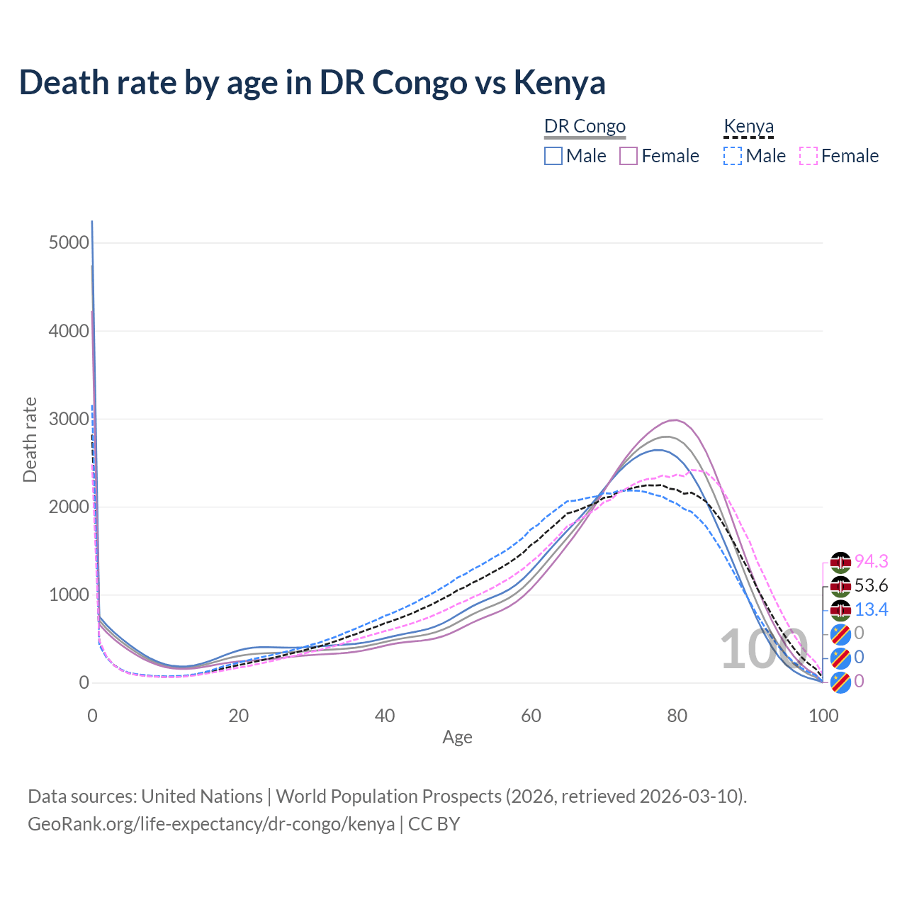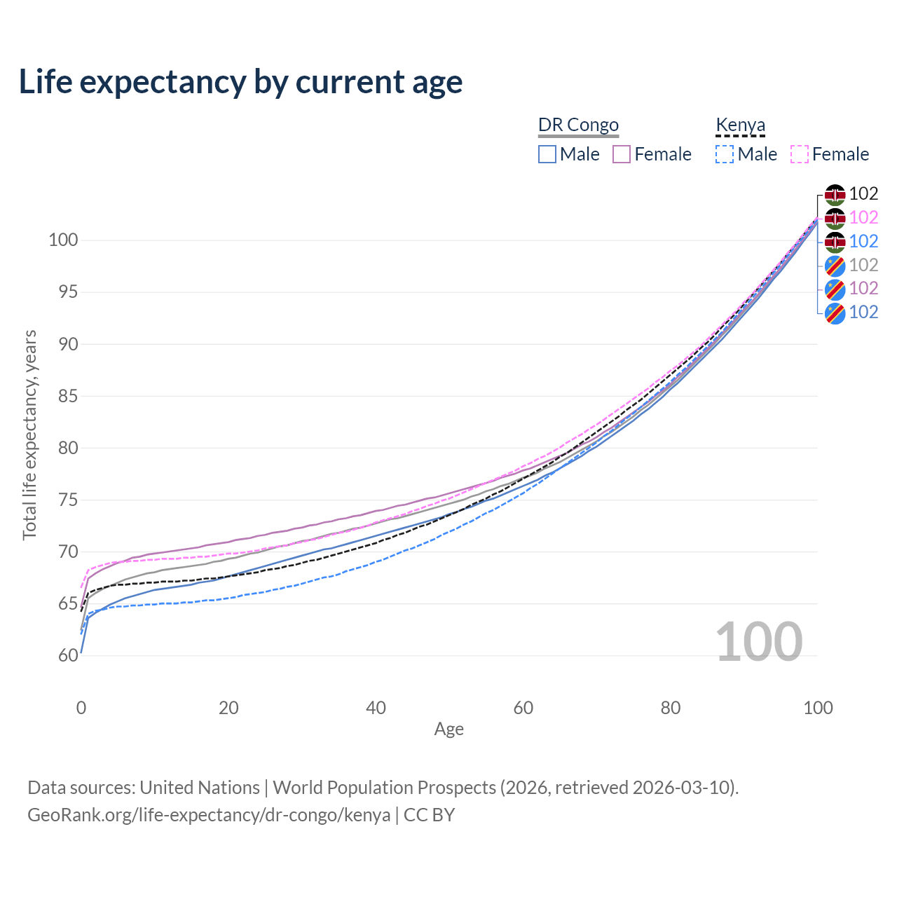 This life expectancy calculator shows the odds of living to 100, 95, 90, and below based on current age for both males and females in the DR Congo and Kenya, along with mean and median age of death. The calculations are based on the 2026 life tables (actuarial tables) from the UN World Population Prospects.