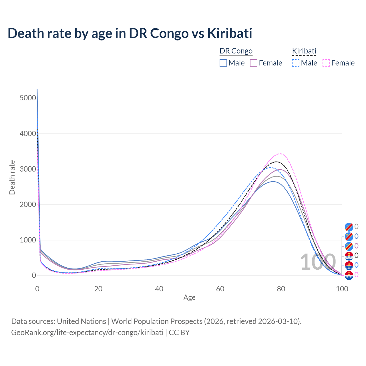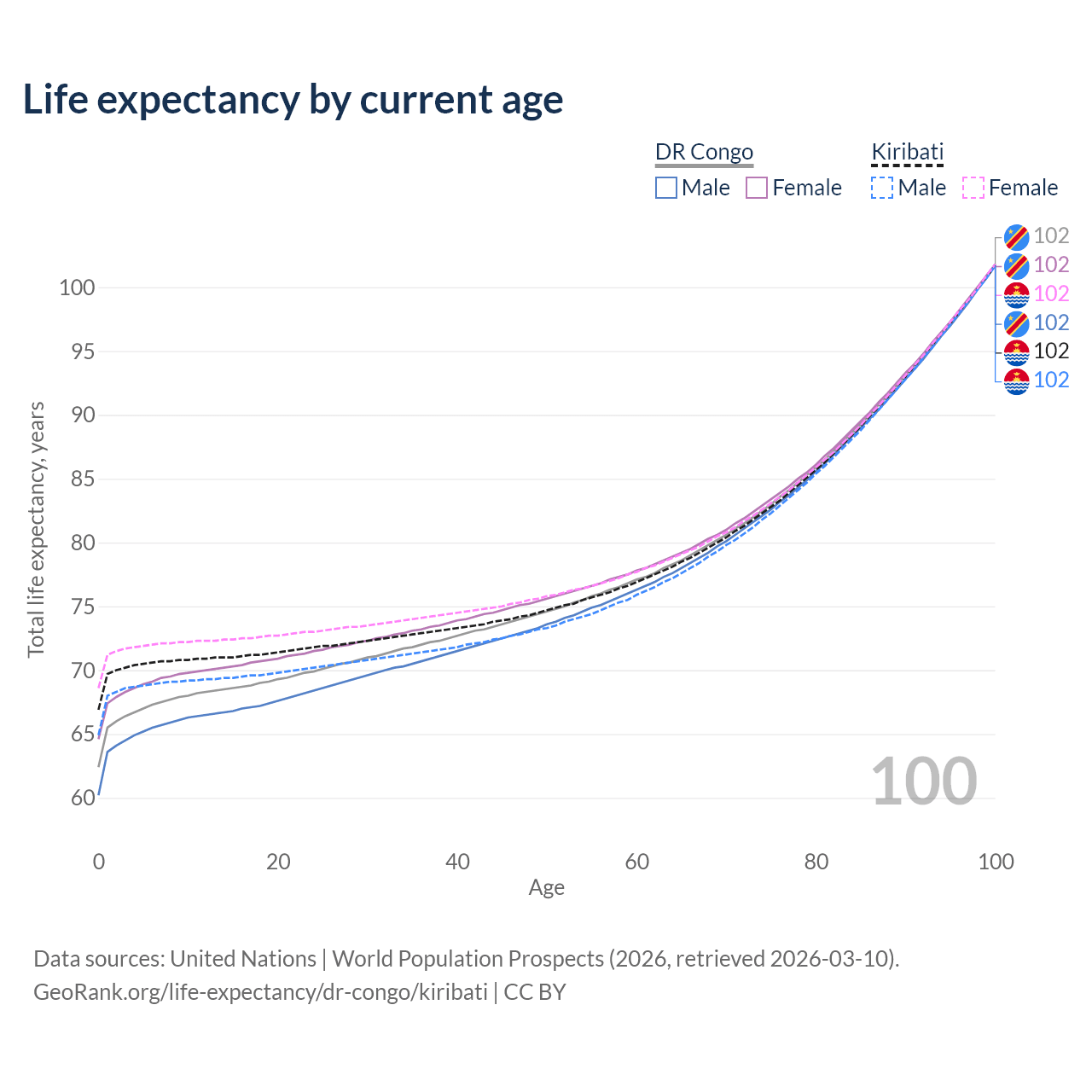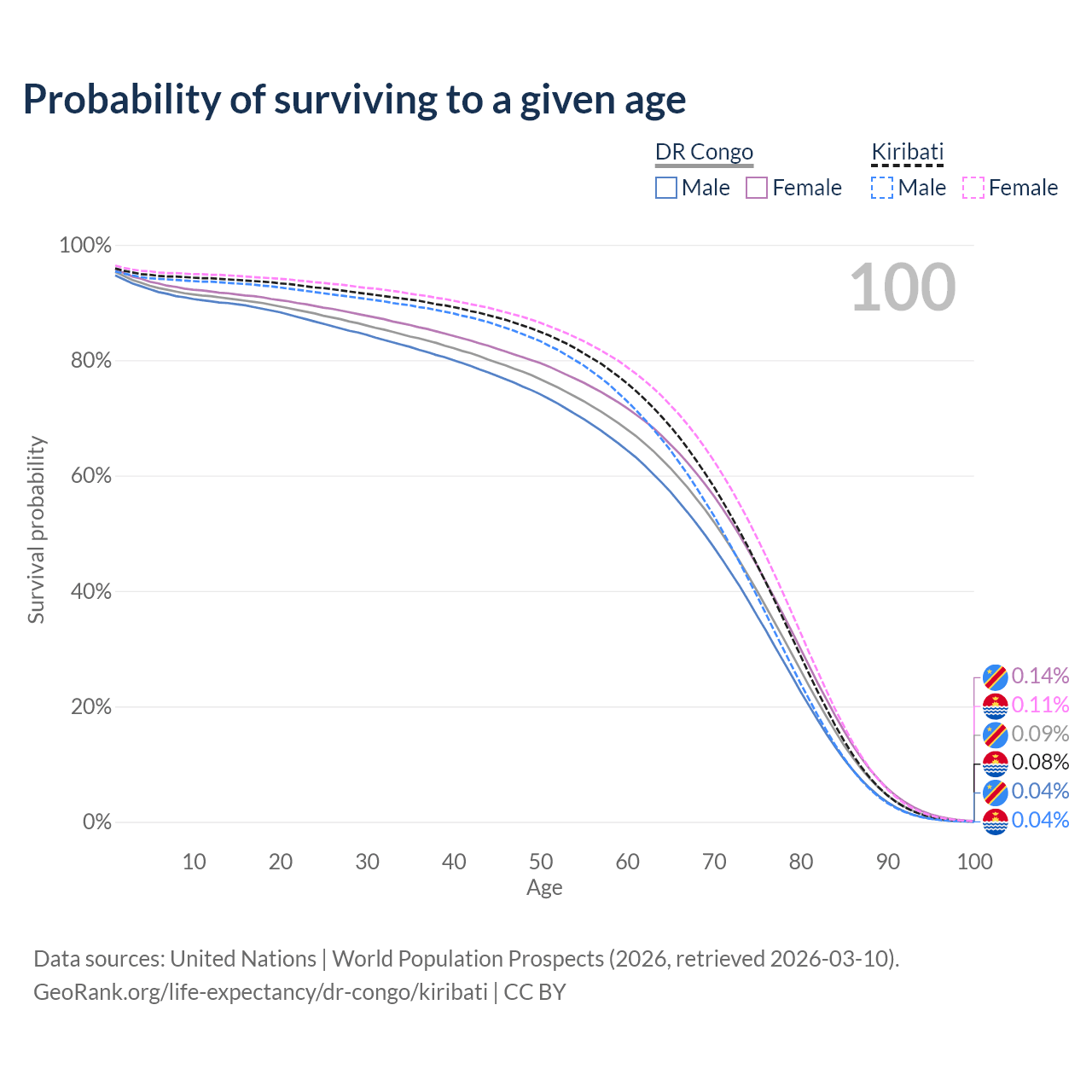 This life expectancy calculator shows the odds of living to 100, 95, 90, and below based on current age for both males and females in the DR Congo and Kiribati, along with mean and median age of death. The calculations are based on the 2026 life tables (actuarial tables) from the UN World Population Prospects.