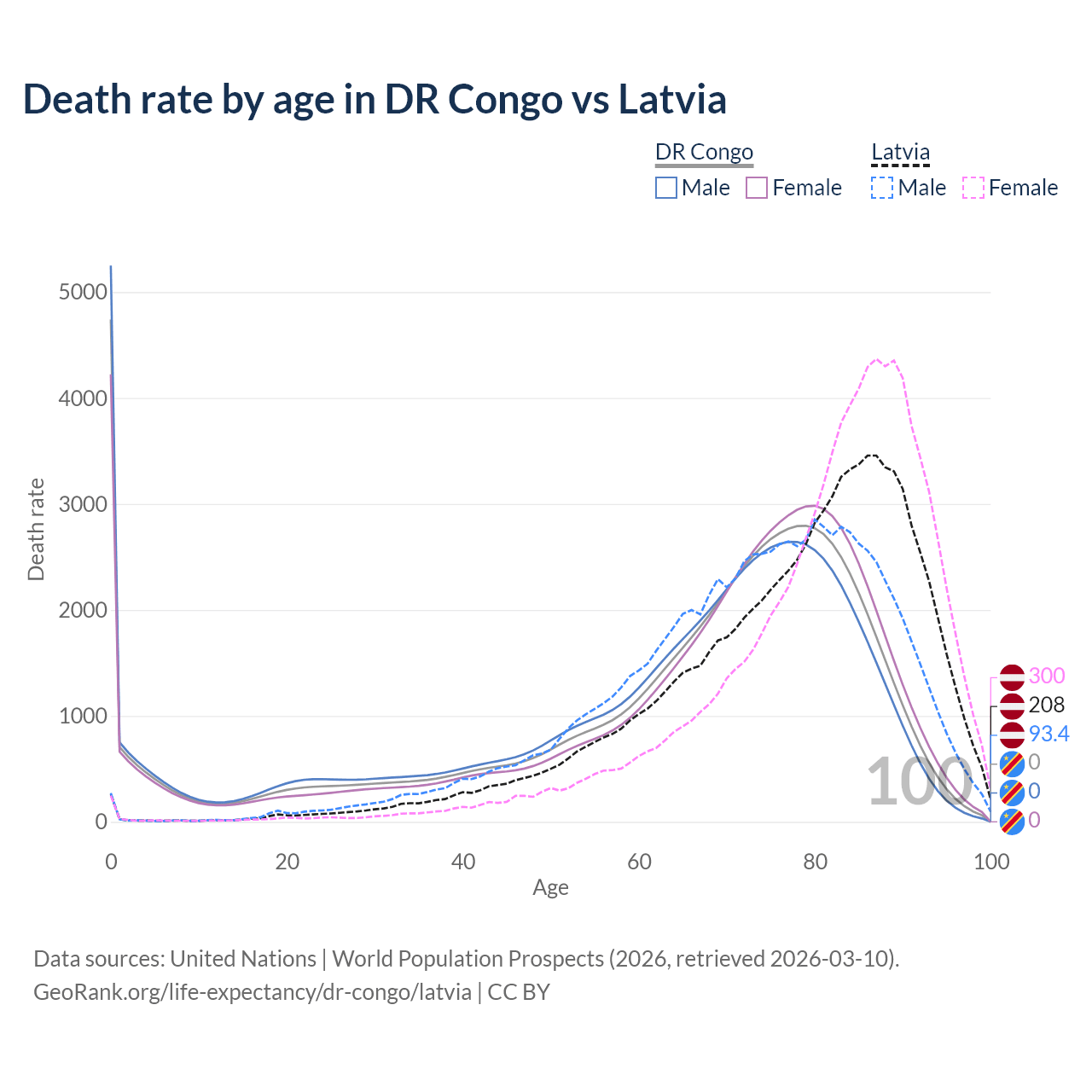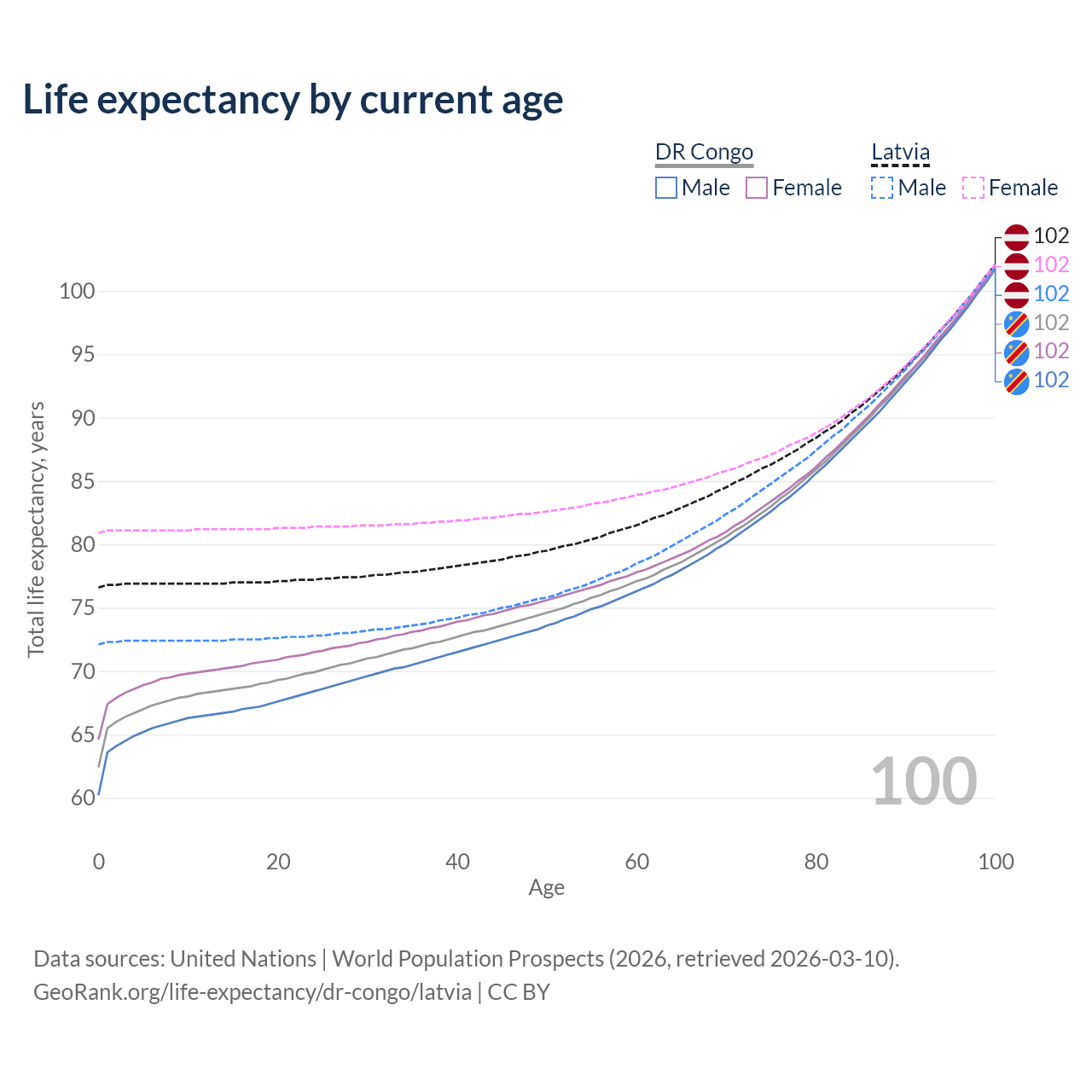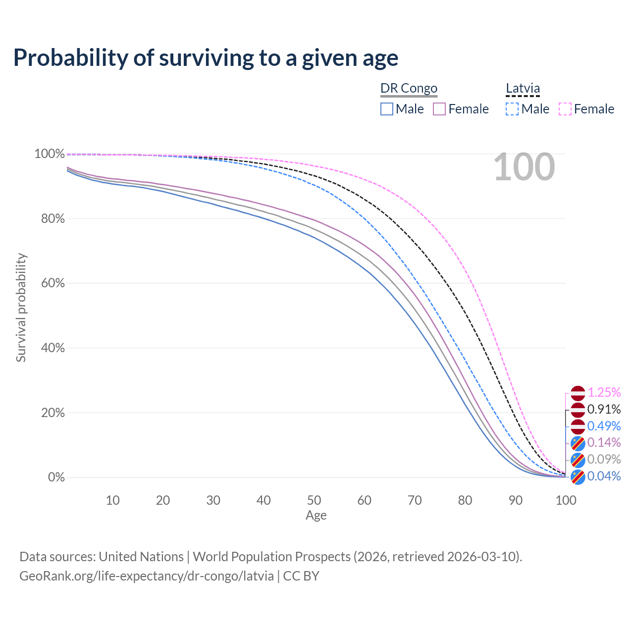 This life expectancy calculator shows the odds of living to 100, 95, 90, and below based on current age for both males and females in the DR Congo and Latvia, along with mean and median age of death. The calculations are based on the 2026 life tables (actuarial tables) from the UN World Population Prospects.