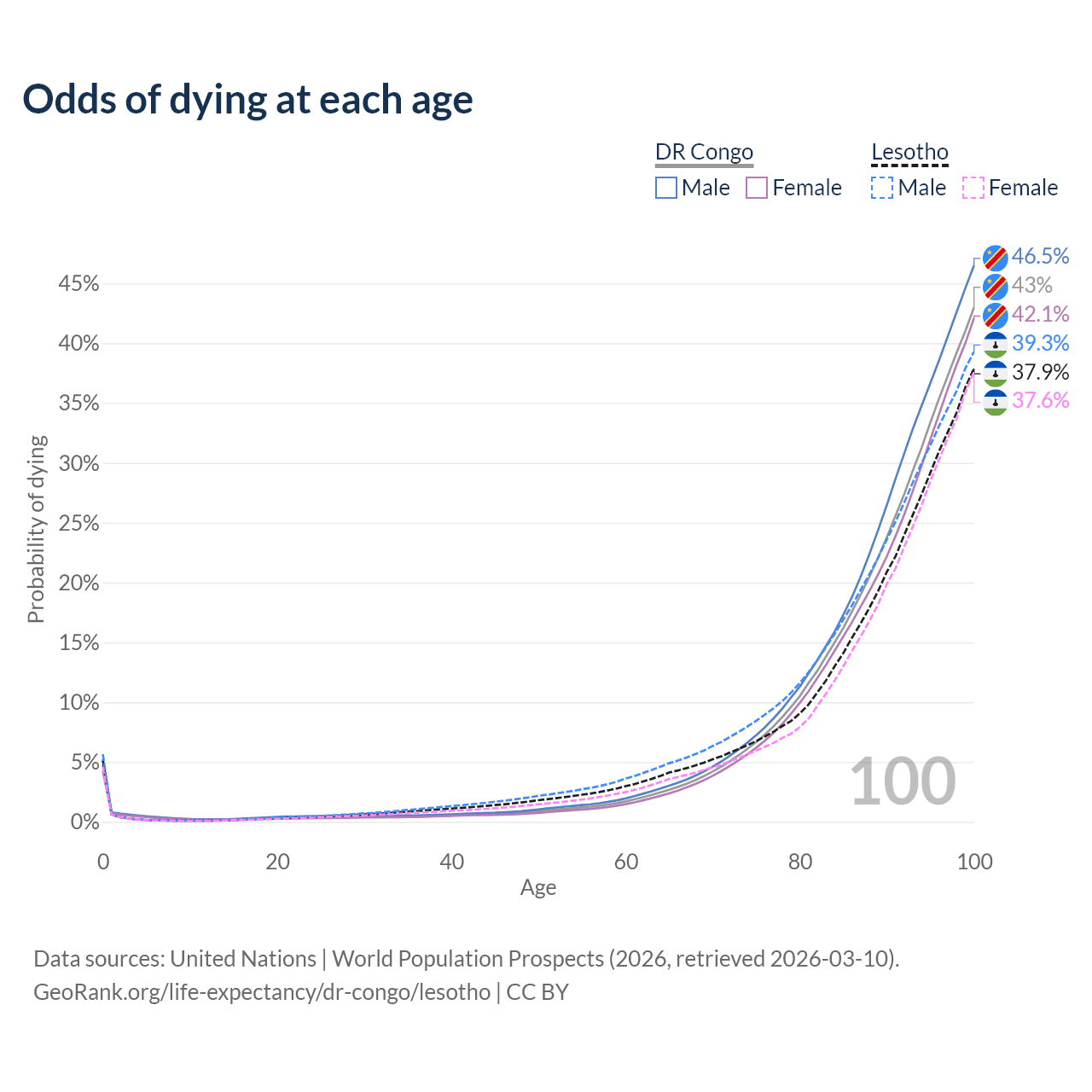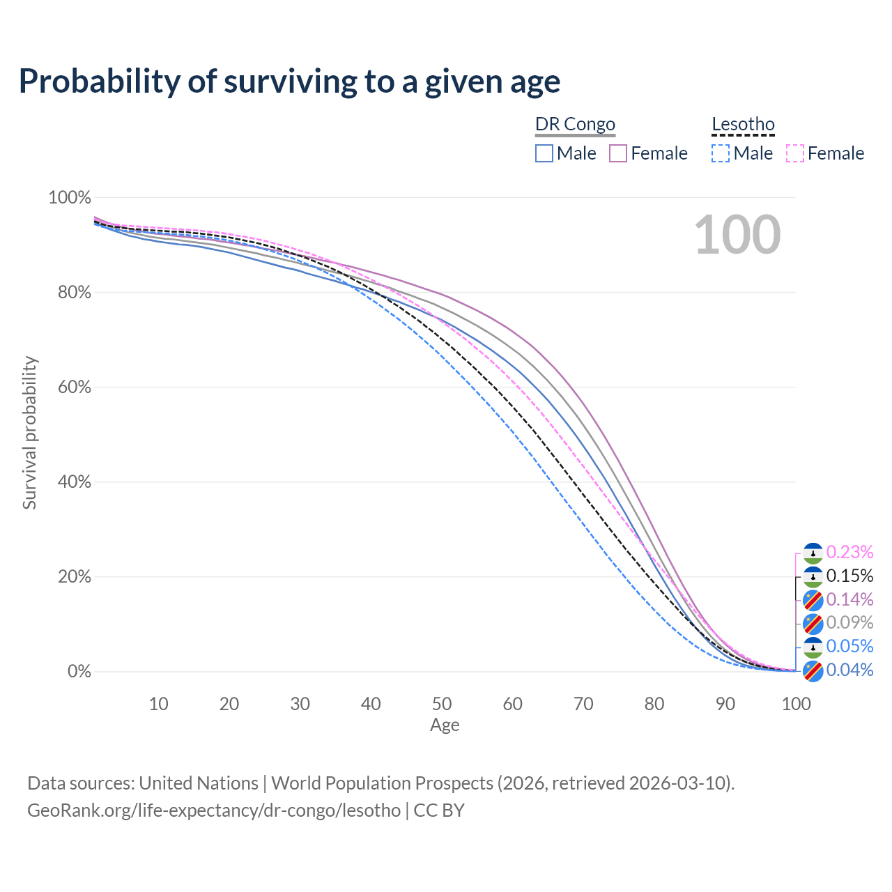 This life expectancy calculator shows the odds of living to 100, 95, 90, and below based on current age for both males and females in the DR Congo and Lesotho, along with mean and median age of death. The calculations are based on the 2026 life tables (actuarial tables) from the UN World Population Prospects.