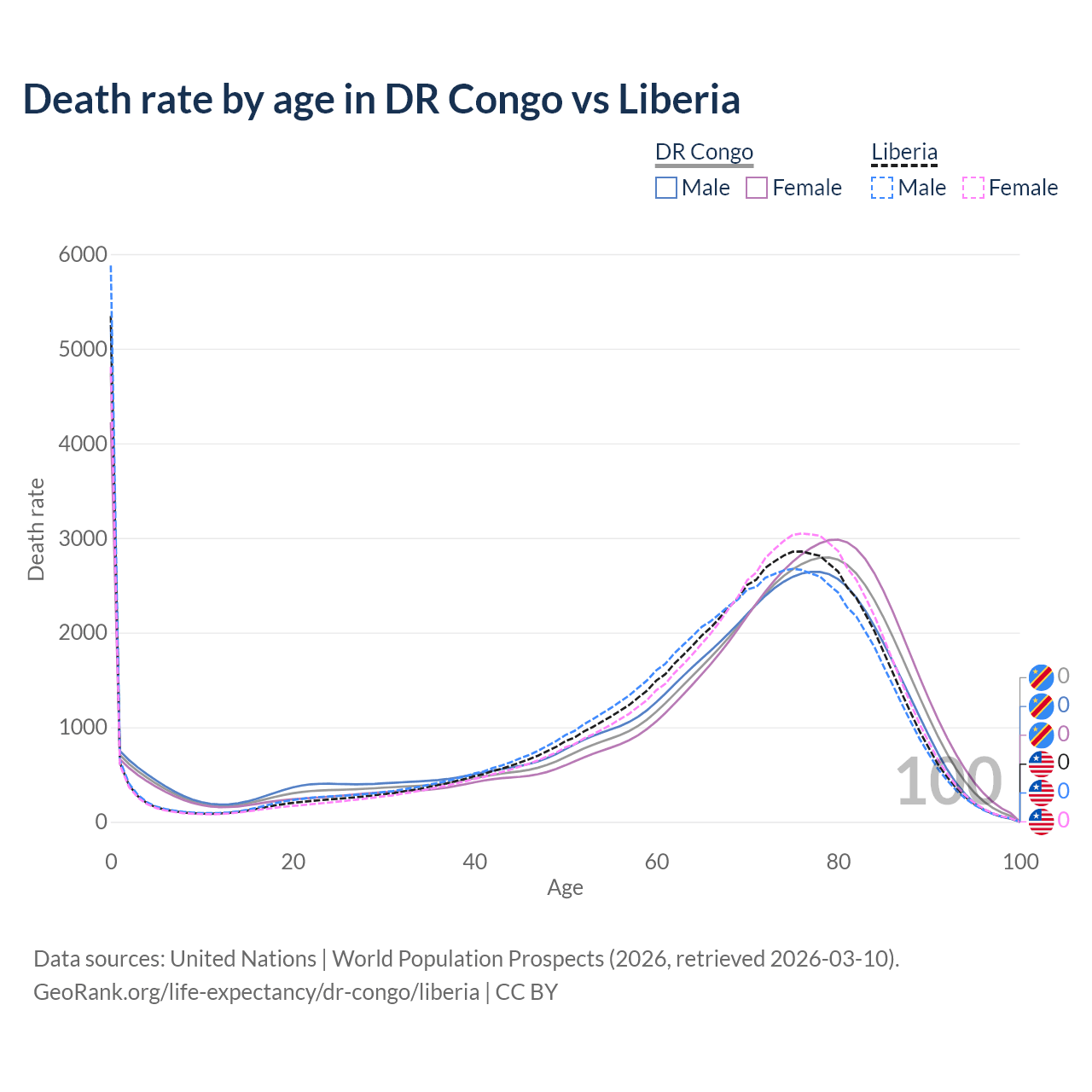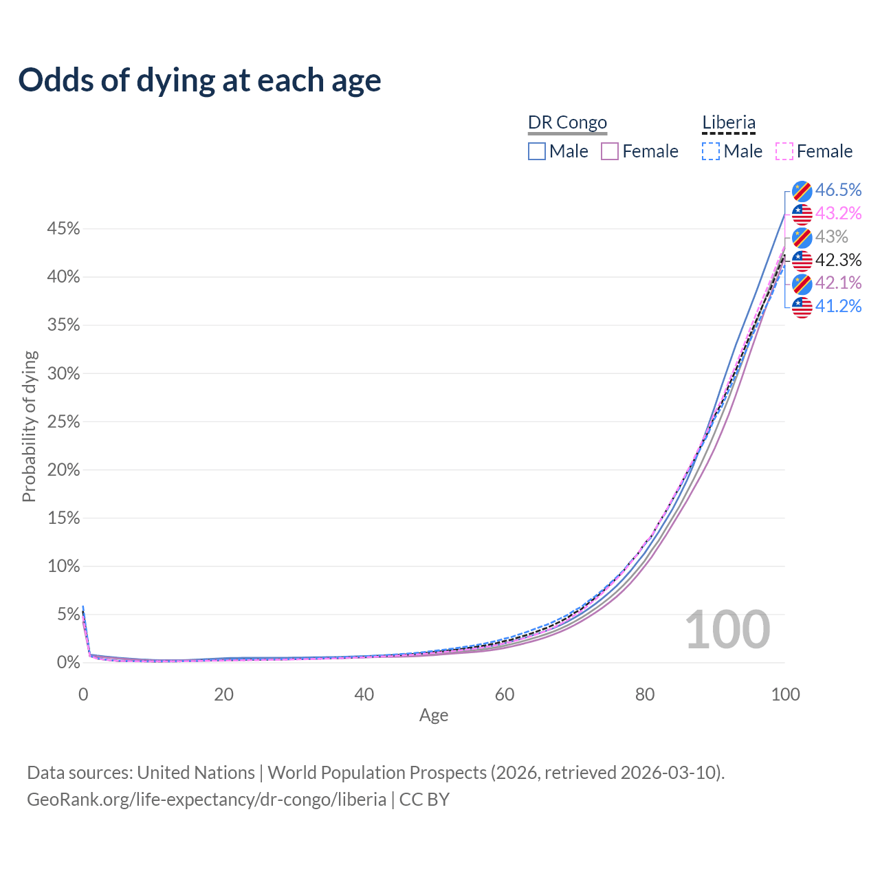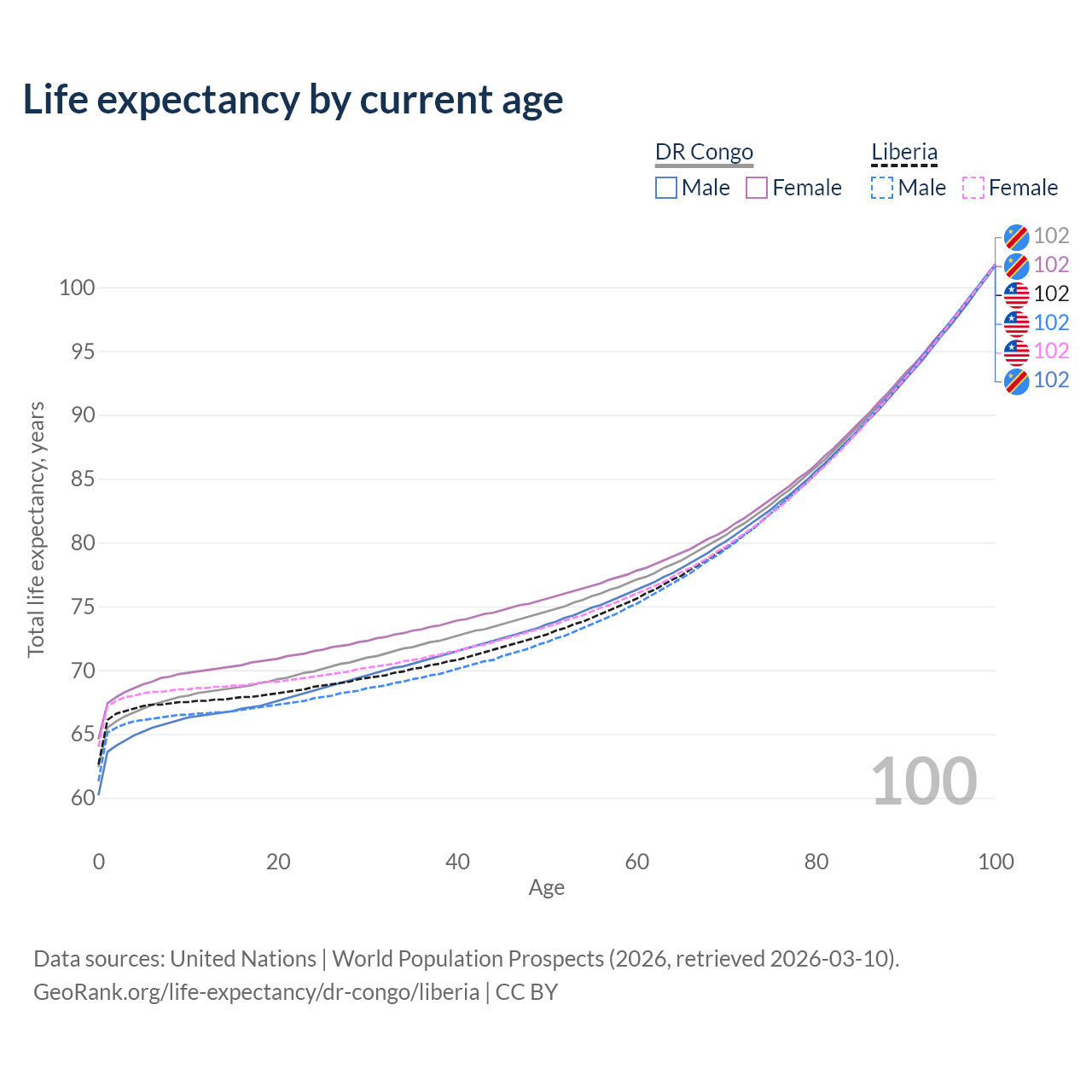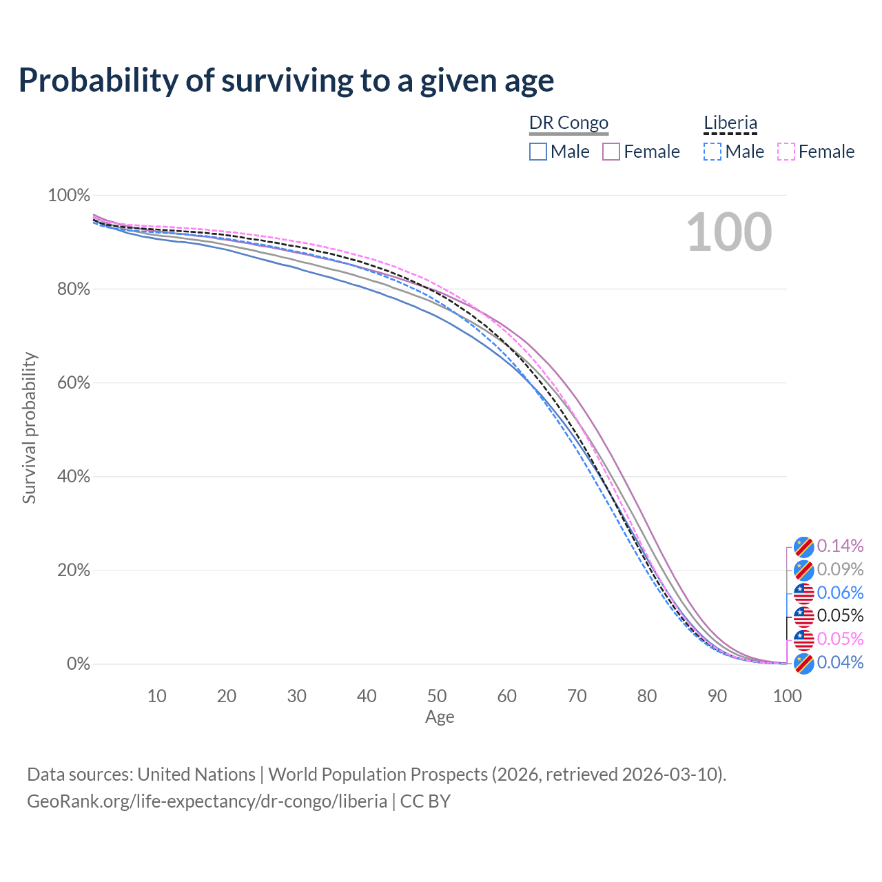 This life expectancy calculator shows the odds of living to 100, 95, 90, and below based on current age for both males and females in the DR Congo and Liberia, along with mean and median age of death. The calculations are based on the 2026 life tables (actuarial tables) from the UN World Population Prospects.