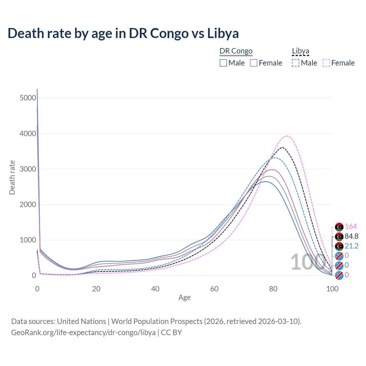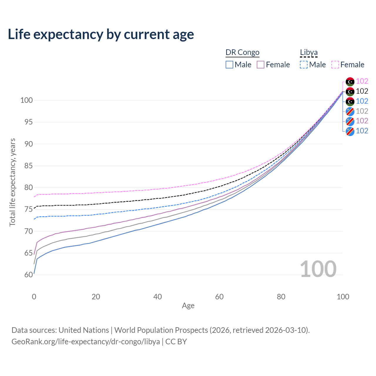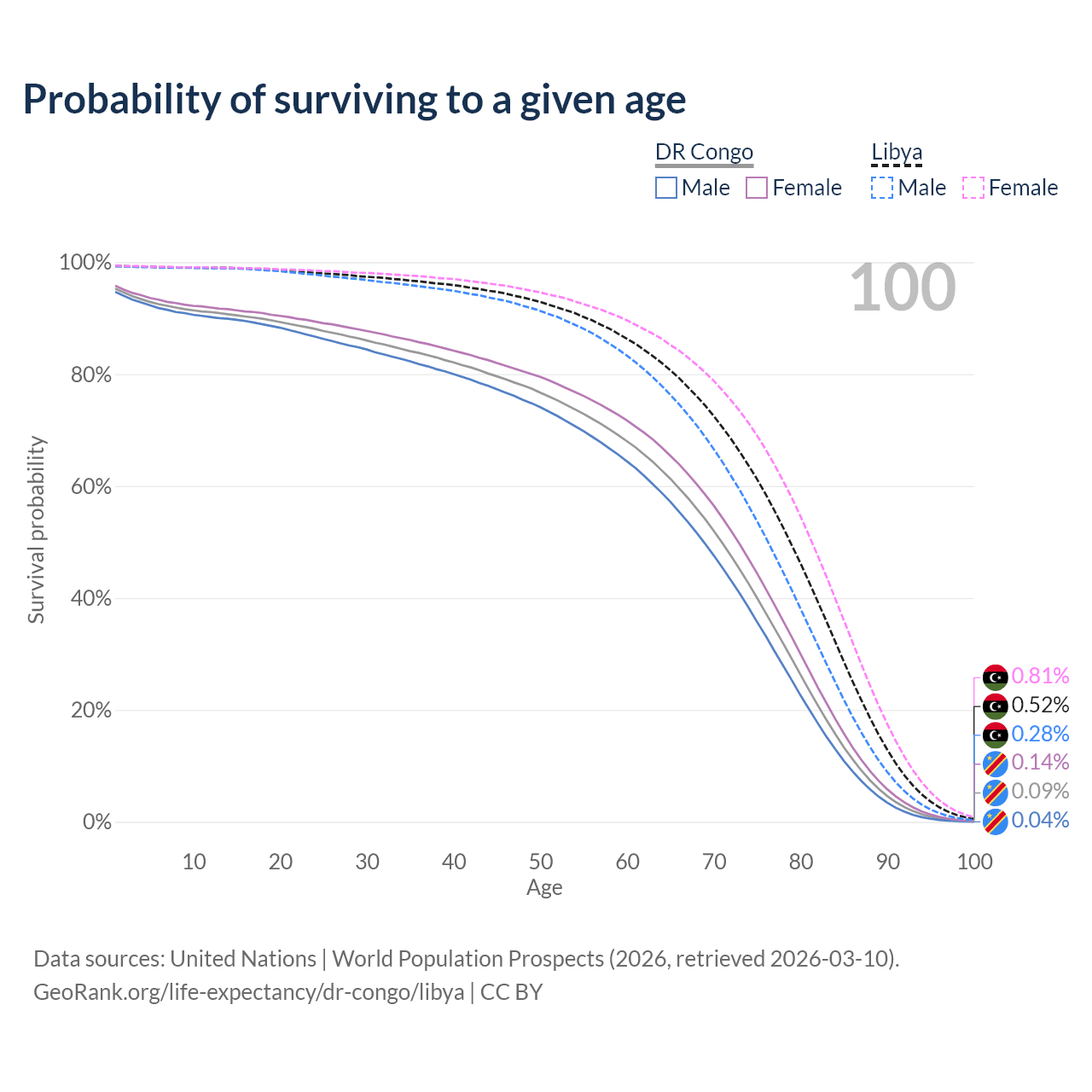 This life expectancy calculator shows the odds of living to 100, 95, 90, and below based on current age for both males and females in the DR Congo and Libya, along with mean and median age of death. The calculations are based on the 2026 life tables (actuarial tables) from the UN World Population Prospects.