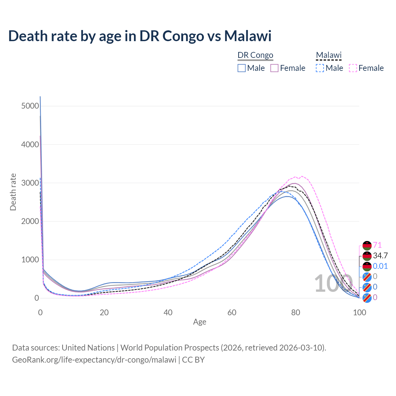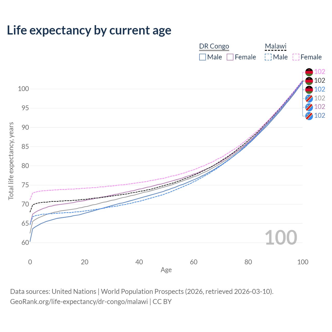 This life expectancy calculator shows the odds of living to 100, 95, 90, and below based on current age for both males and females in the DR Congo and Malawi, along with mean and median age of death. The calculations are based on the 2026 life tables (actuarial tables) from the UN World Population Prospects.