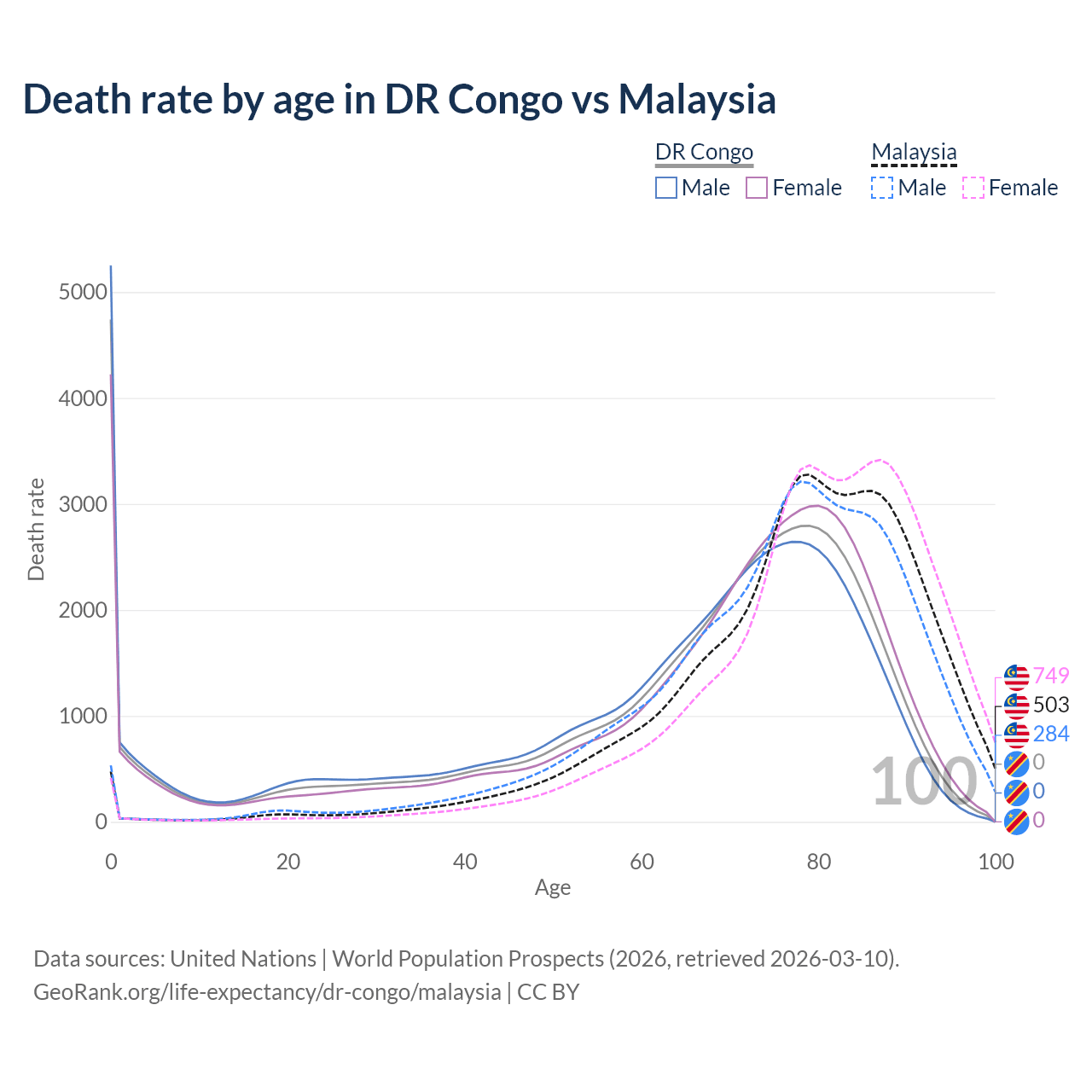 In the DR Congo, the most common age of death is 0, compared to 79 in Malaysia. The median age of death is 70.9 in the DR Congo and 79.8 in Malaysia, meaning only half of each cohort is expected to live past that age.