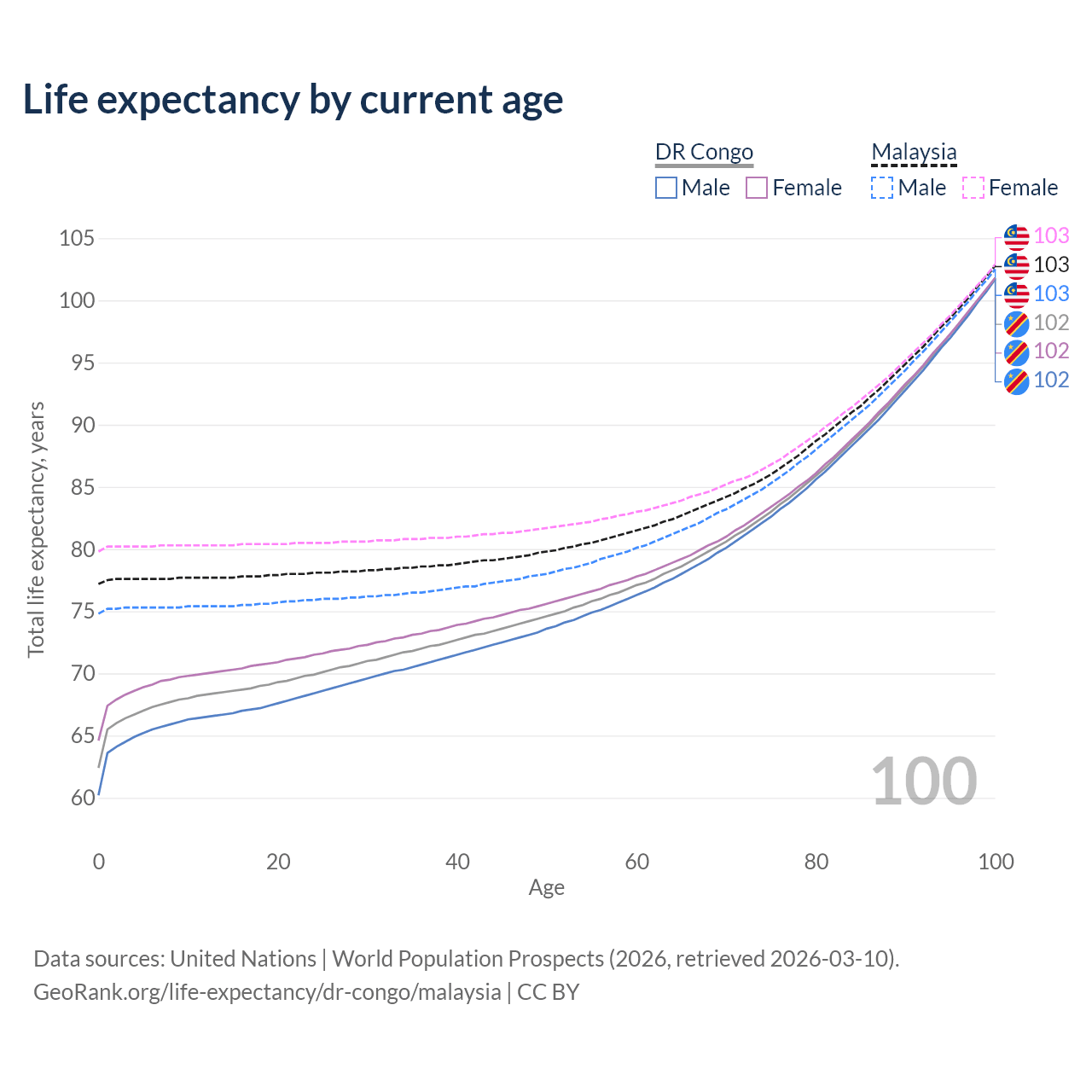 This life expectancy calculator shows the odds of living to 100, 95, 90, and below based on current age for both males and females in the DR Congo and Malaysia, along with mean and median age of death. The calculations are based on the 2026 life tables (actuarial tables) from the UN World Population Prospects.