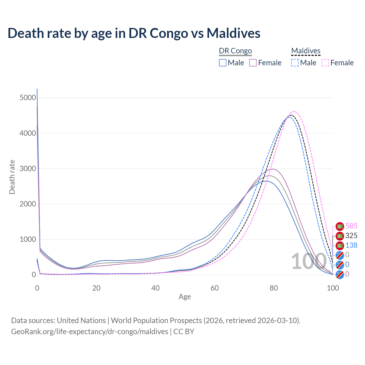 In the DR Congo, the most common age of death is 0, compared to 86 in Maldives. The median age of death is 70.9 in the DR Congo and 83.8 in Maldives, meaning only half of each cohort is expected to live past that age.