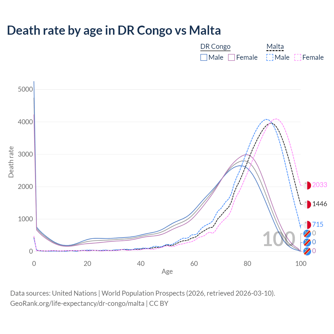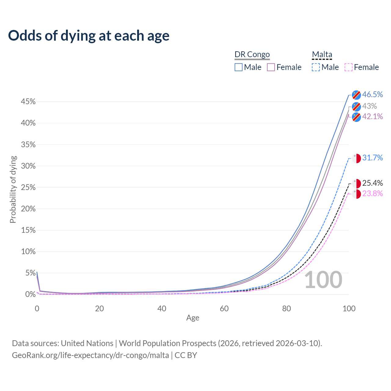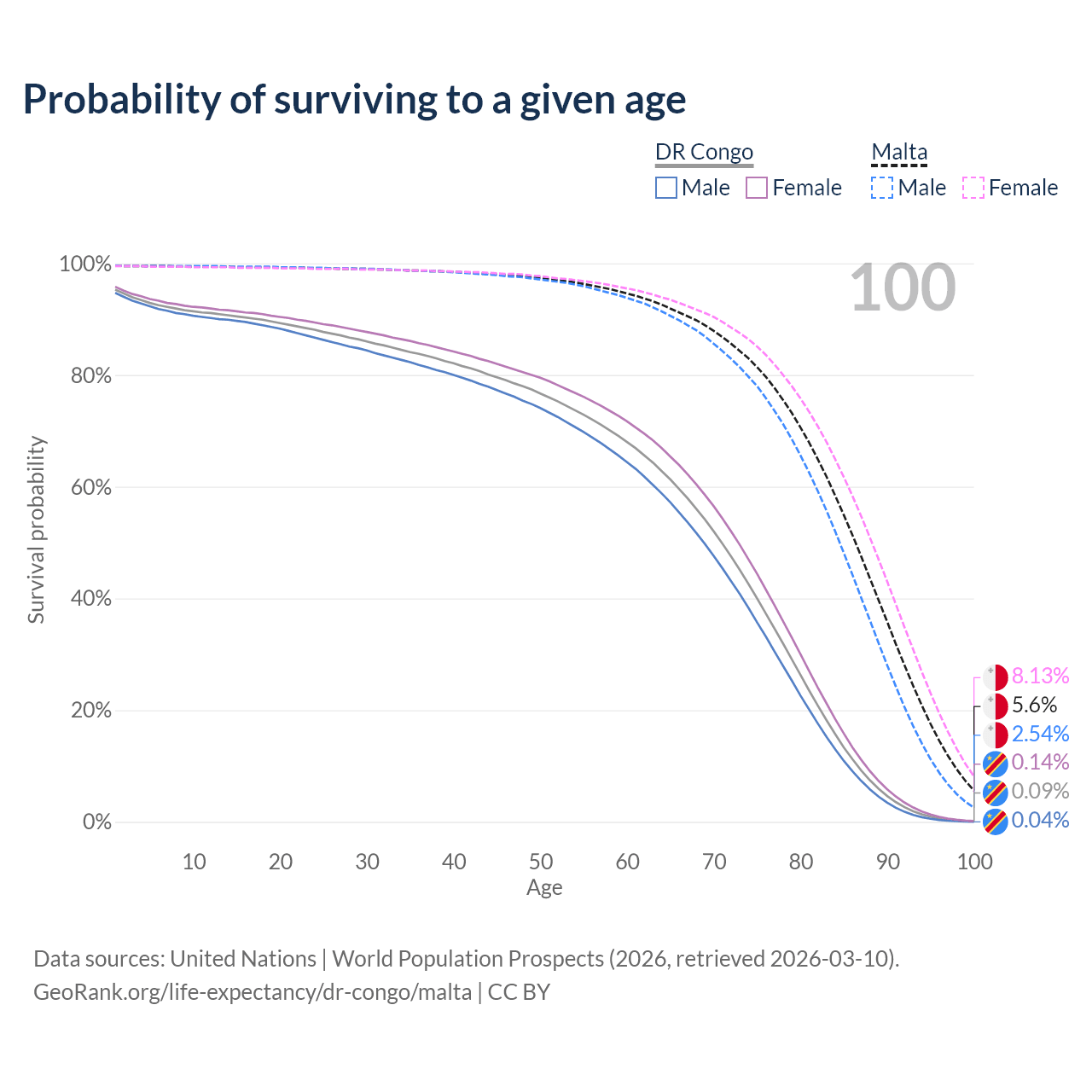 This life expectancy calculator shows the odds of living to 100, 95, 90, and below based on current age for both males and females in the DR Congo and Malta, along with mean and median age of death. The calculations are based on the 2026 life tables (actuarial tables) from the UN World Population Prospects.