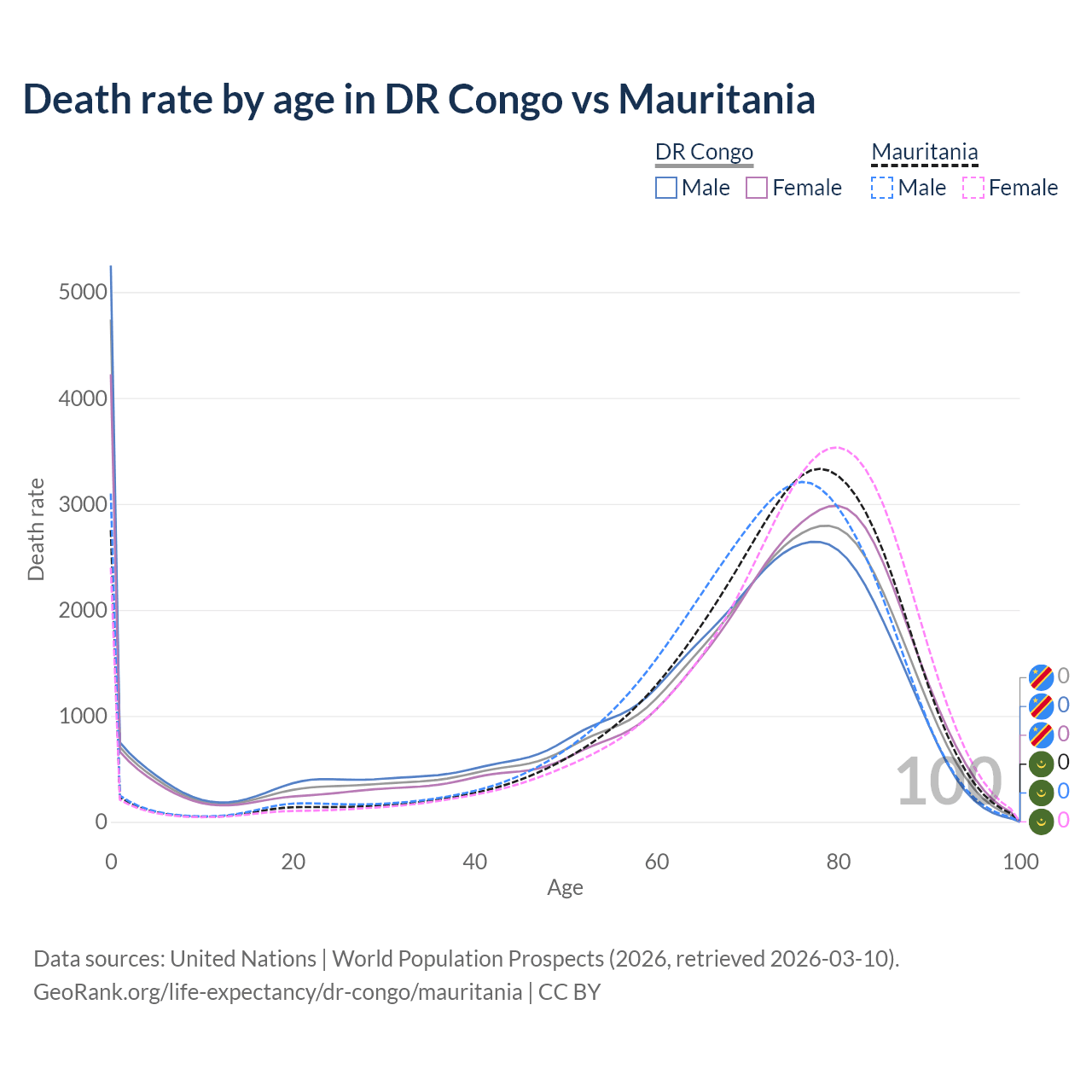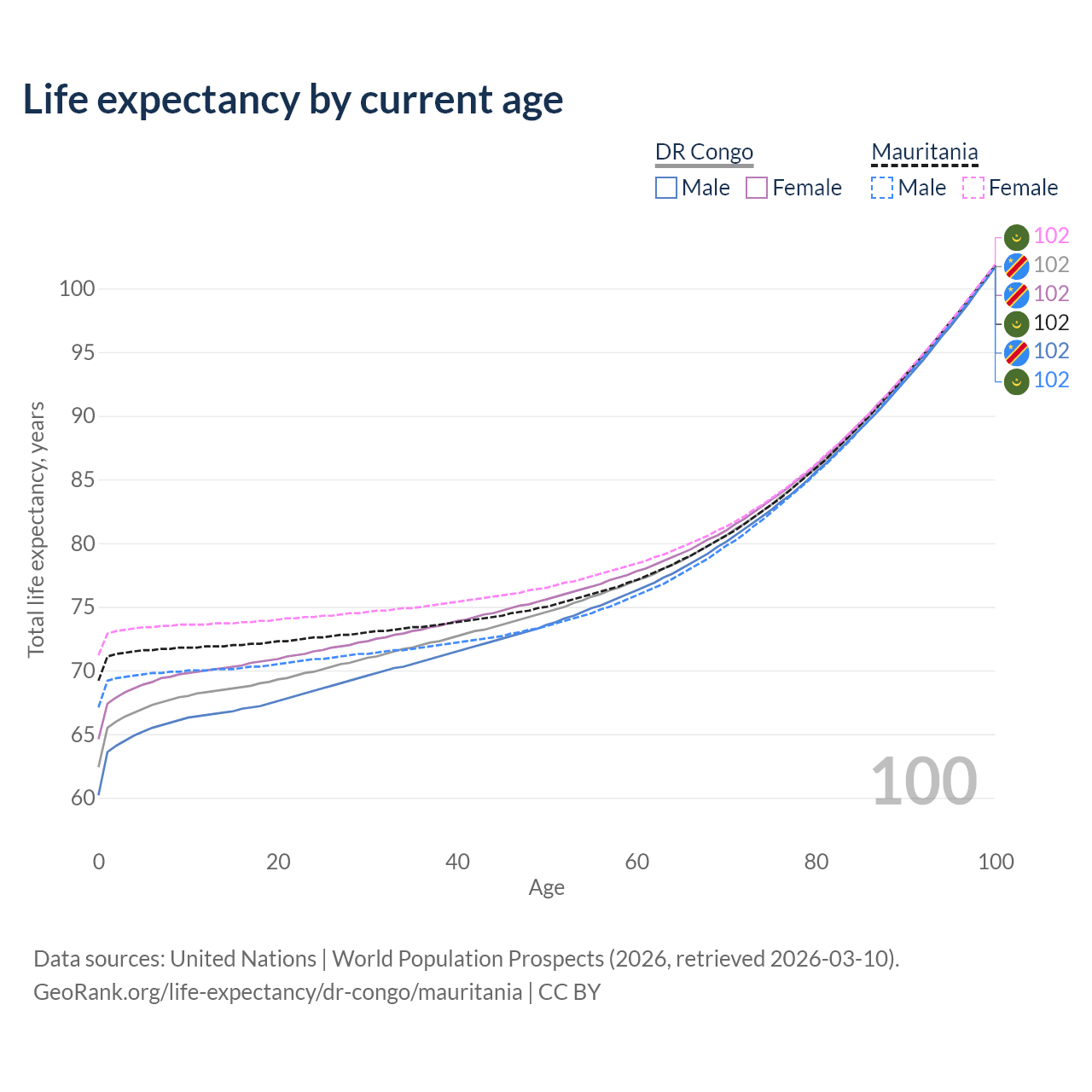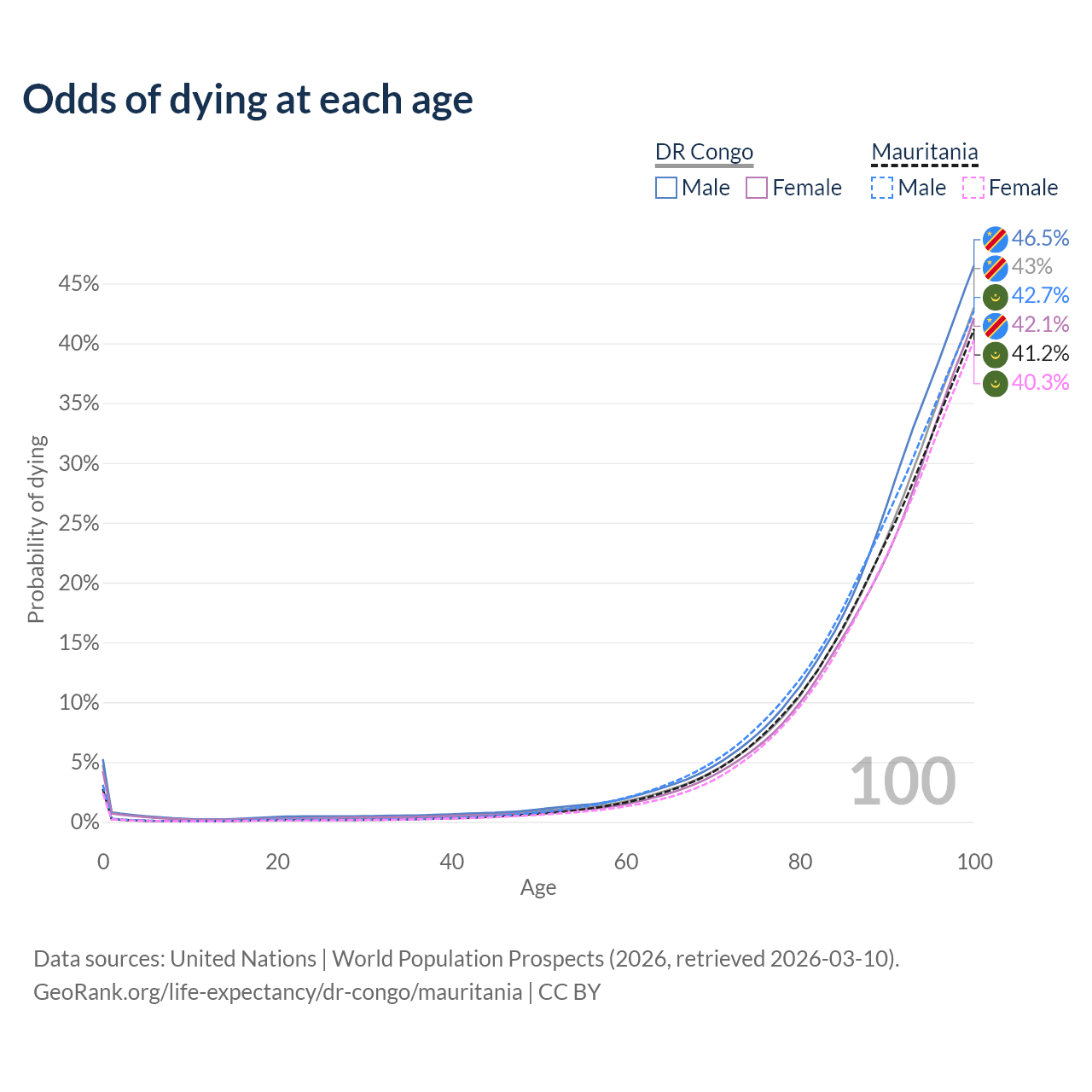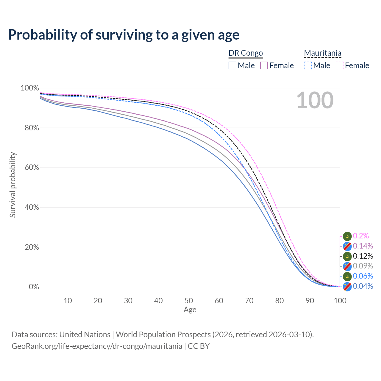 This life expectancy calculator shows the odds of living to 100, 95, 90, and below based on current age for both males and females in the DR Congo and Mauritania, along with mean and median age of death. The calculations are based on the 2026 life tables (actuarial tables) from the UN World Population Prospects.