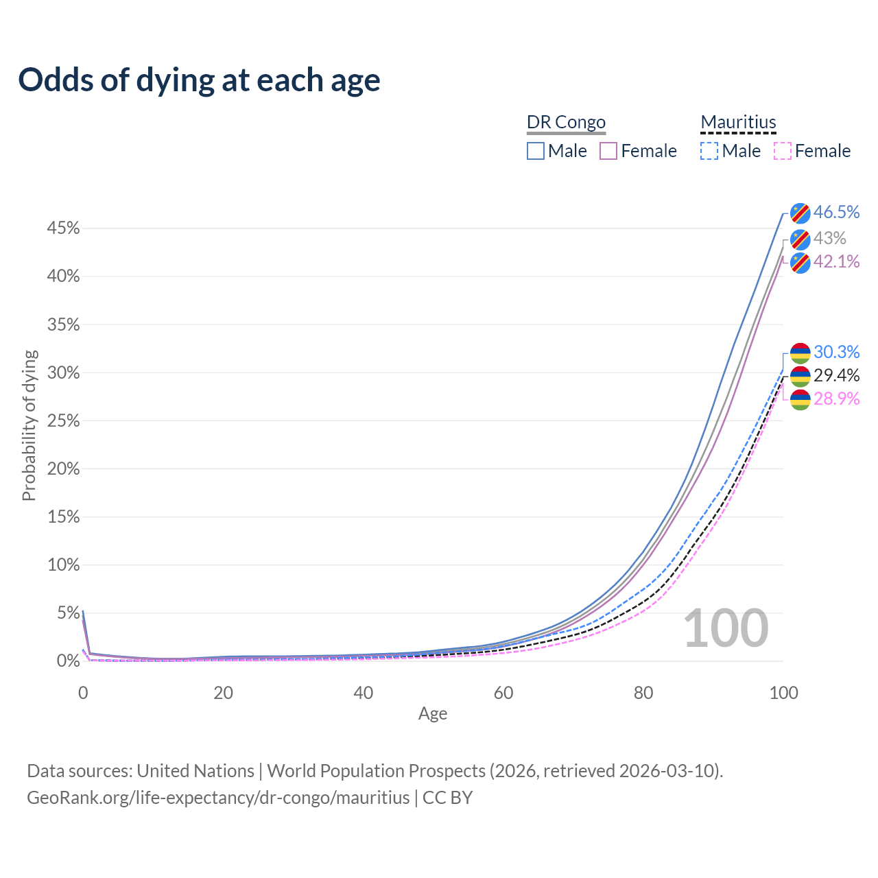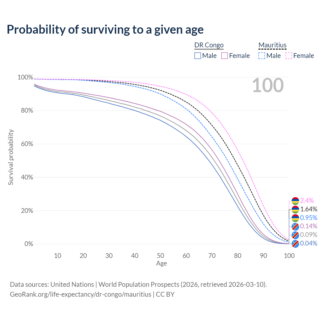 This life expectancy calculator shows the odds of living to 100, 95, 90, and below based on current age for both males and females in the DR Congo and Mauritius, along with mean and median age of death. The calculations are based on the 2026 life tables (actuarial tables) from the UN World Population Prospects.
