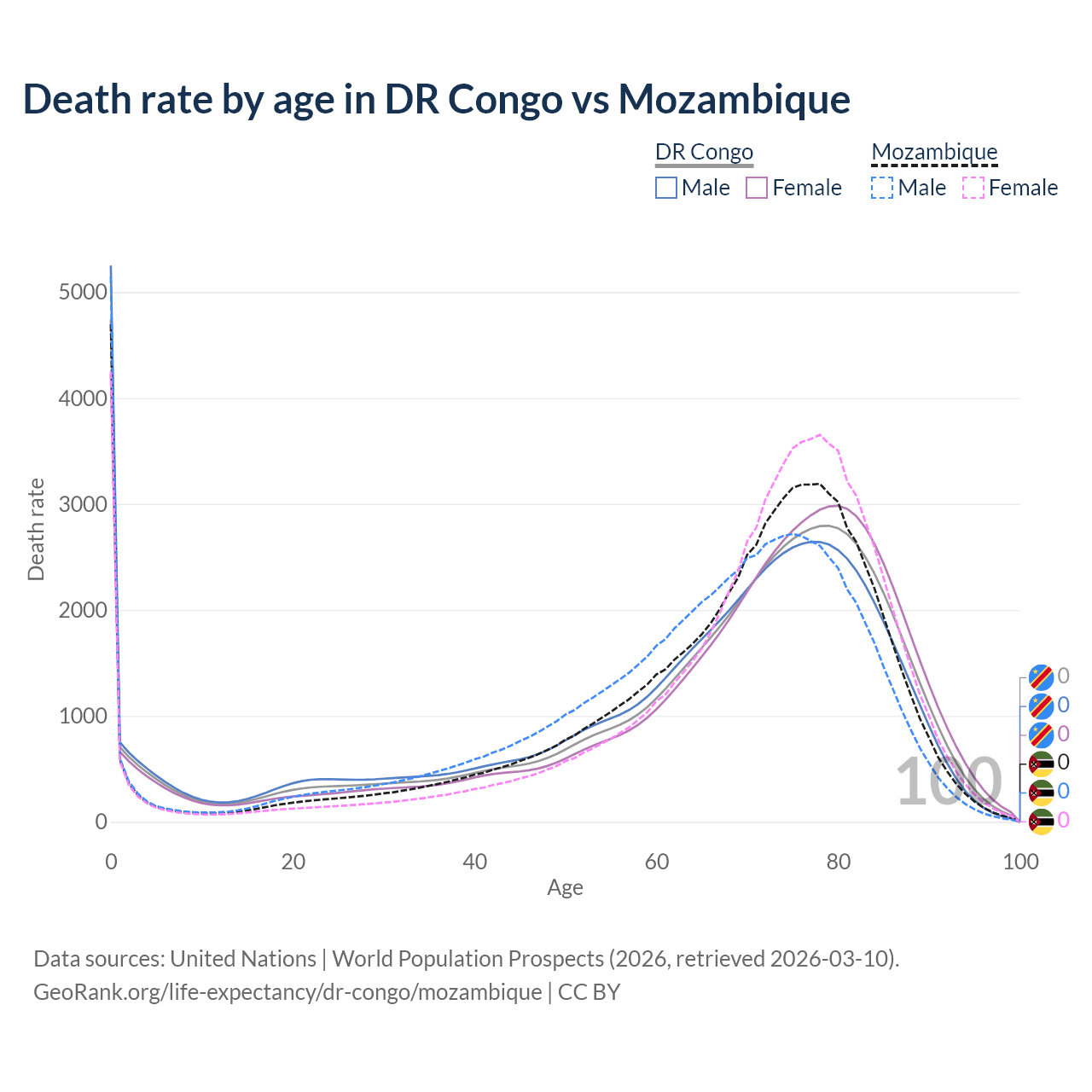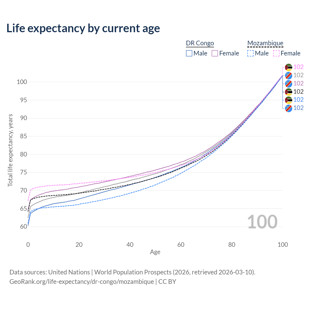 This life expectancy calculator shows the odds of living to 100, 95, 90, and below based on current age for both males and females in the DR Congo and Mozambique, along with mean and median age of death. The calculations are based on the 2026 life tables (actuarial tables) from the UN World Population Prospects.