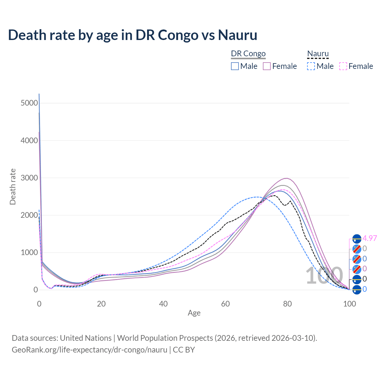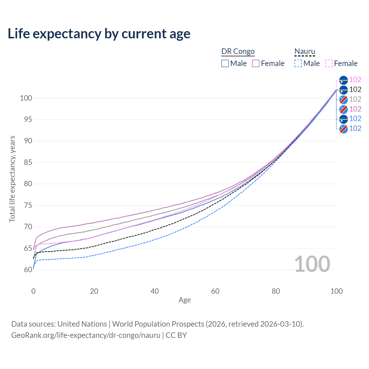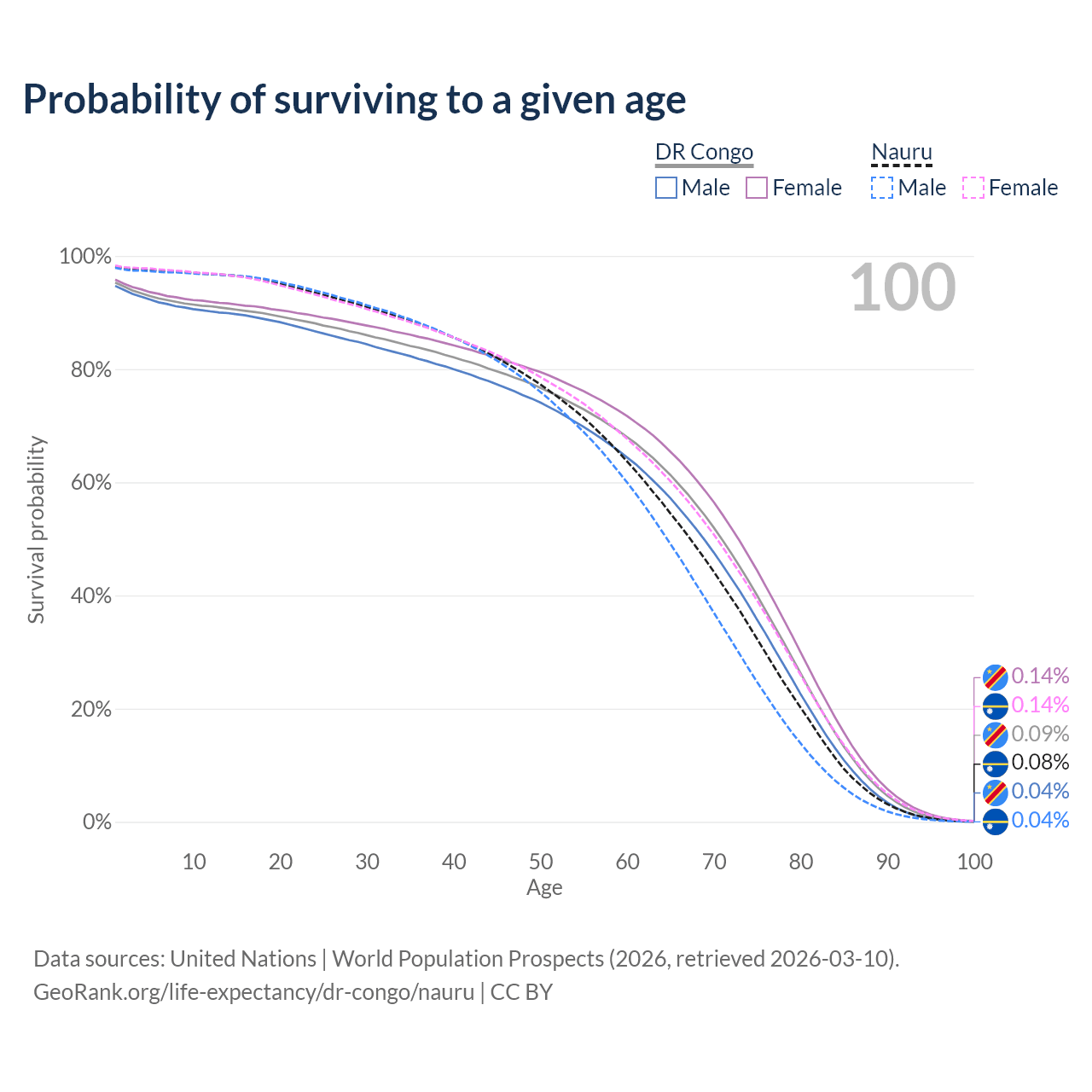 This life expectancy calculator shows the odds of living to 100, 95, 90, and below based on current age for both males and females in the DR Congo and Nauru, along with mean and median age of death. The calculations are based on the 2026 life tables (actuarial tables) from the UN World Population Prospects.