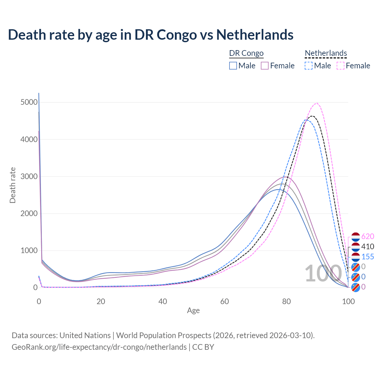 In the DR Congo, the most common age of death is 0, compared to 88 in the Netherlands. The median age of death is 70.9 in the DR Congo and 85.5 in the Netherlands, meaning only half of each cohort is expected to live past that age.