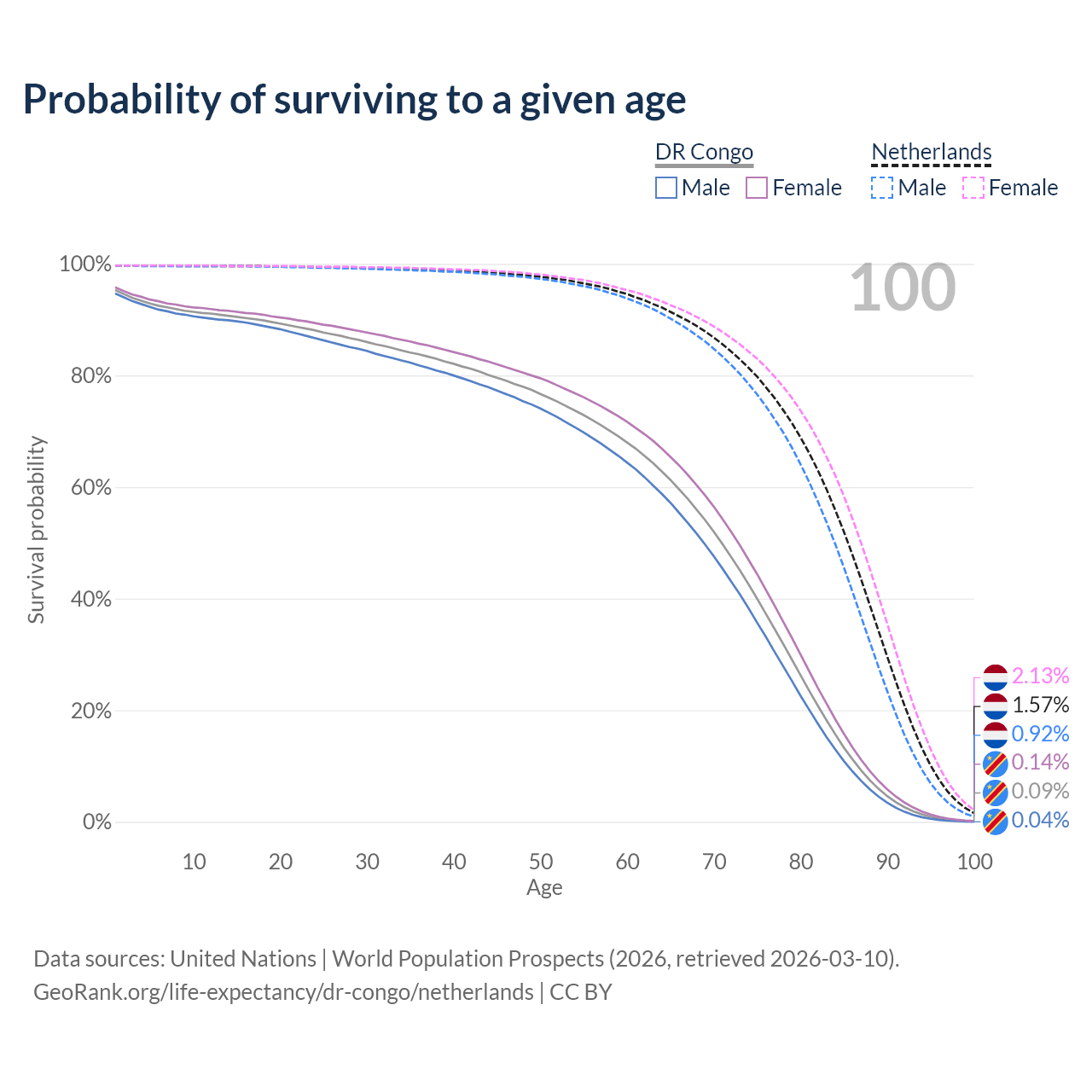 This life expectancy calculator shows the odds of living to 100, 95, 90, and below based on current age for both males and females in the DR Congo and the Netherlands, along with mean and median age of death. The calculations are based on the 2026 life tables (actuarial tables) from the UN World Population Prospects.