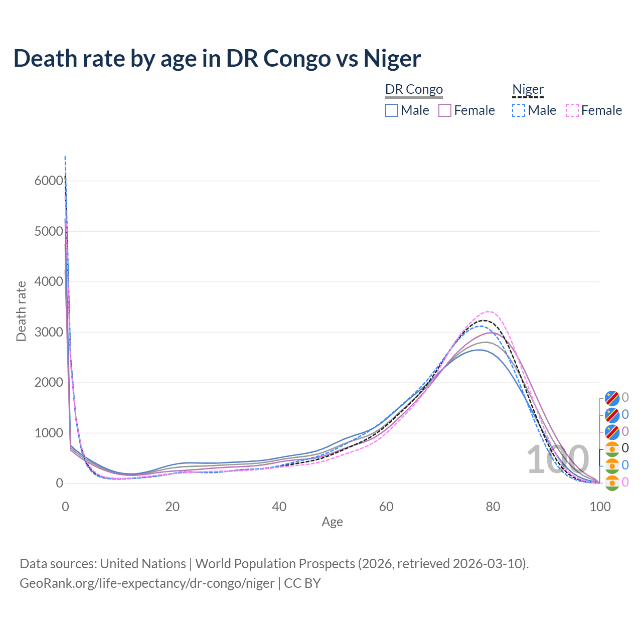 In the DR Congo, the most common age of death is 0, compared to 0 in Niger. The median age of death is 70.9 in the DR Congo and 71.7 in Niger, meaning only half of each cohort is expected to live past that age.