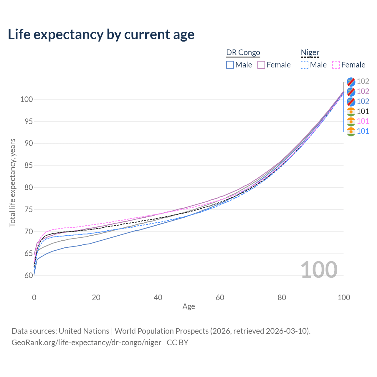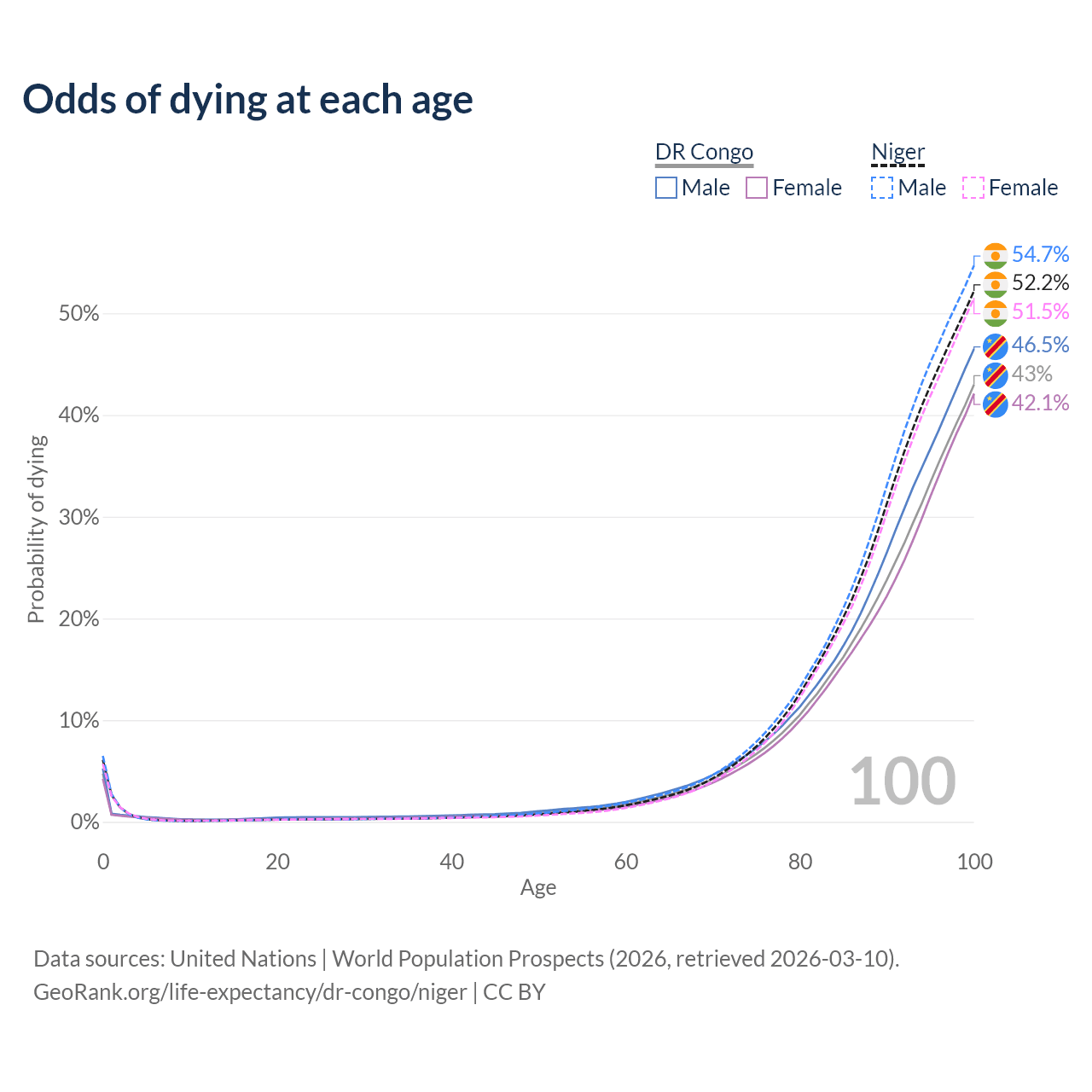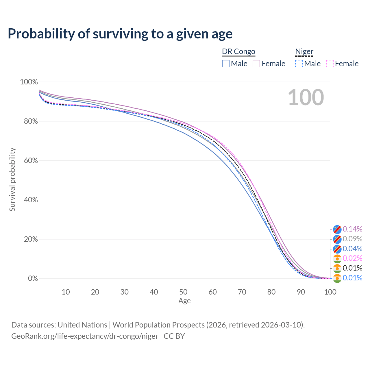 This life expectancy calculator shows the odds of living to 100, 95, 90, and below based on current age for both males and females in the DR Congo and Niger, along with mean and median age of death. The calculations are based on the 2026 life tables (actuarial tables) from the UN World Population Prospects.