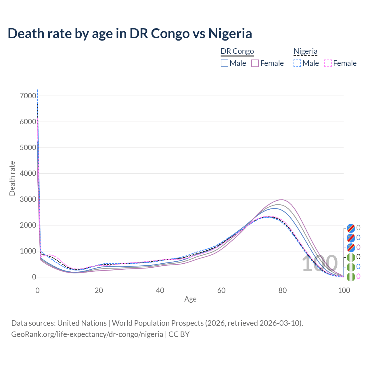 In the DR Congo, the most common age of death is 0, compared to 0 in Nigeria. The median age of death is 70.9 in the DR Congo and 64.3 in Nigeria, meaning only half of each cohort is expected to live past that age.