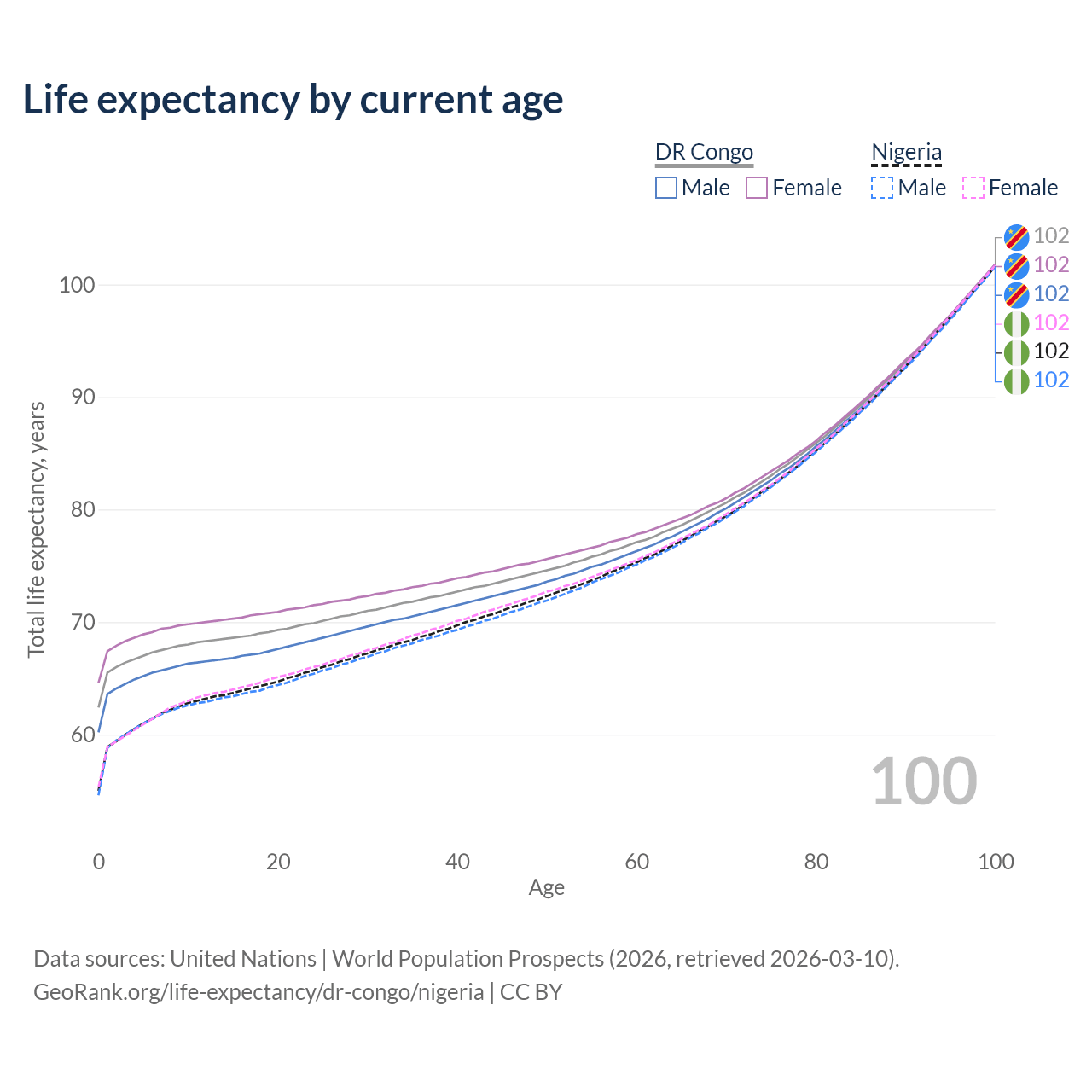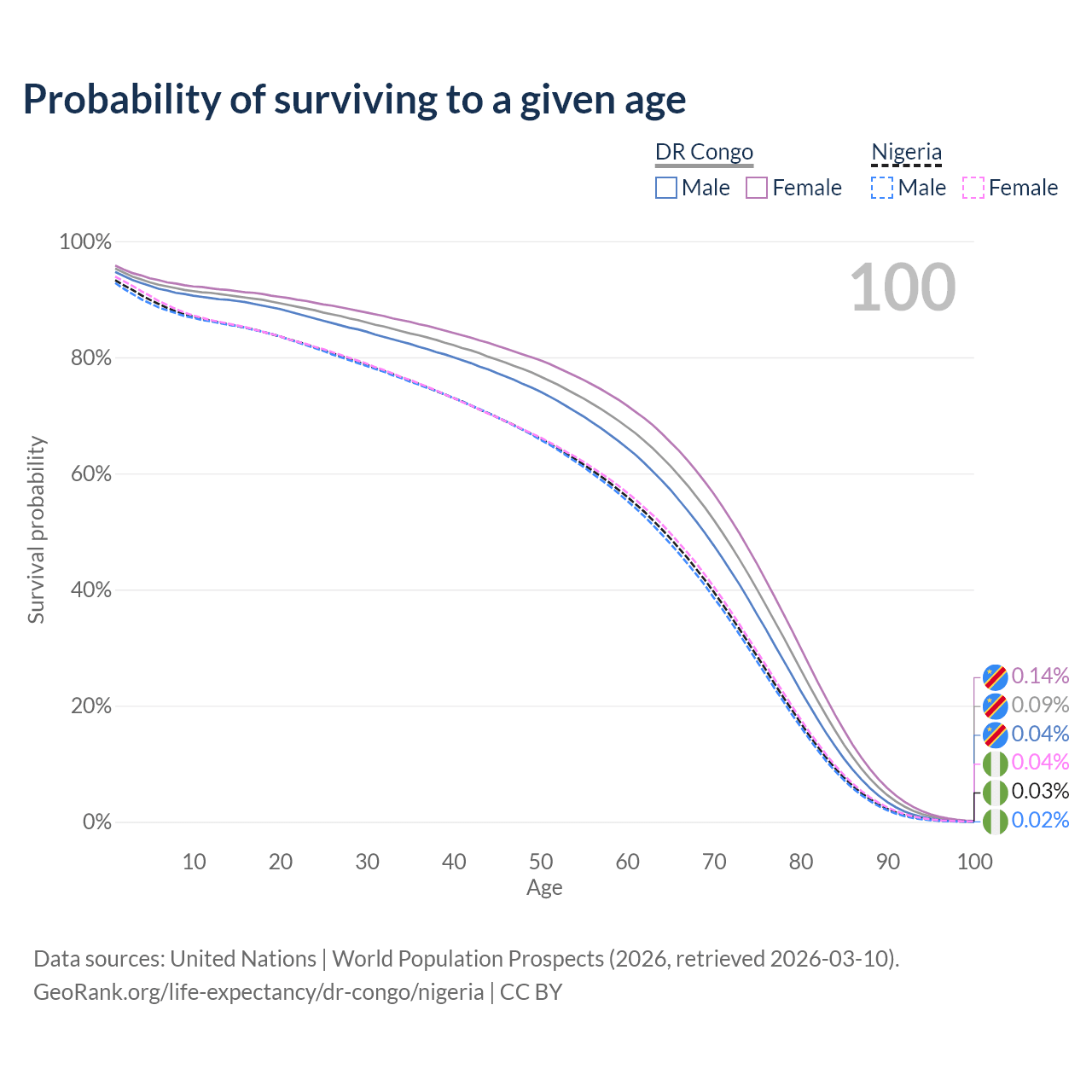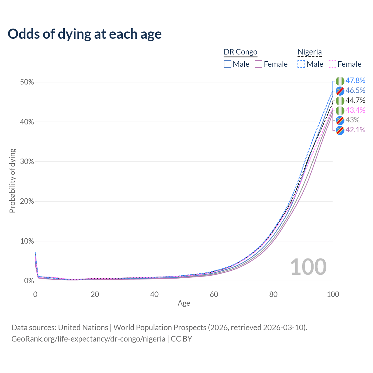 This life expectancy calculator shows the odds of living to 100, 95, 90, and below based on current age for both males and females in the DR Congo and Nigeria, along with mean and median age of death. The calculations are based on the 2026 life tables (actuarial tables) from the UN World Population Prospects.