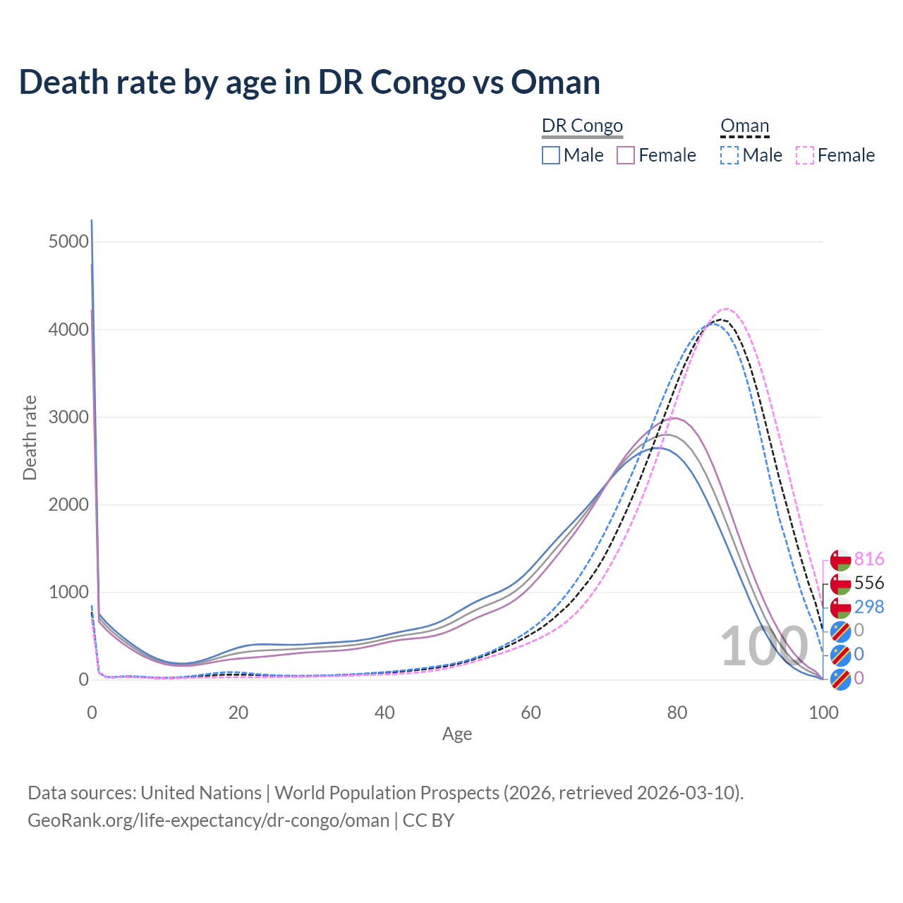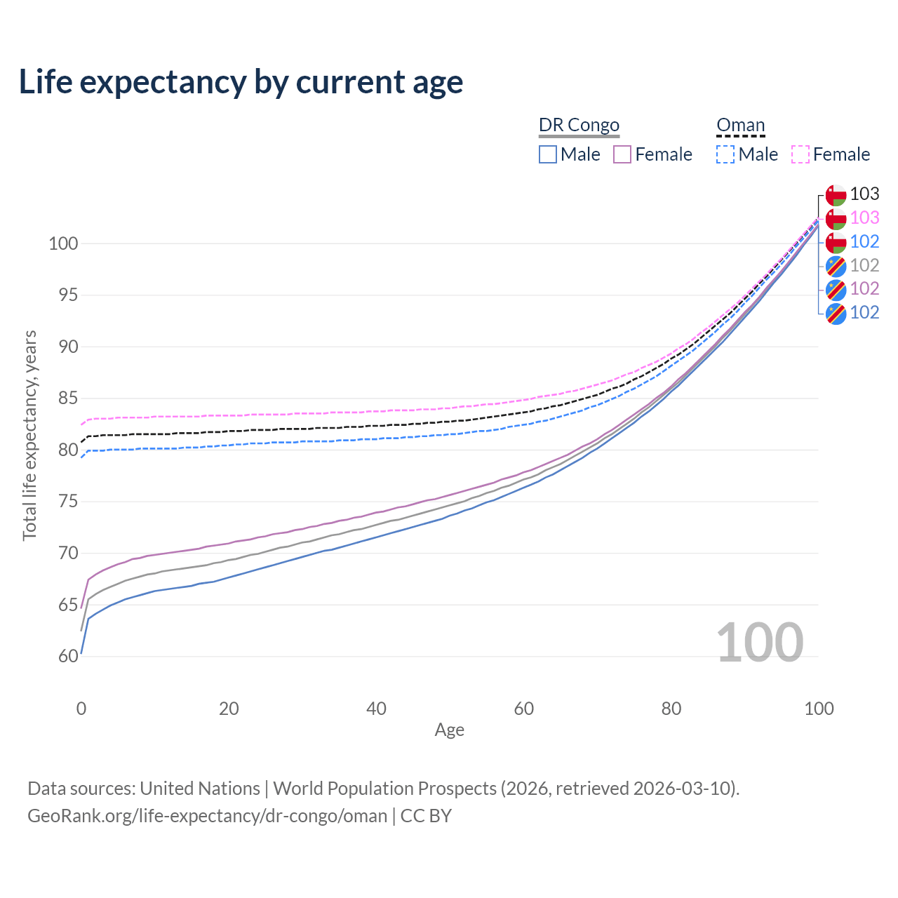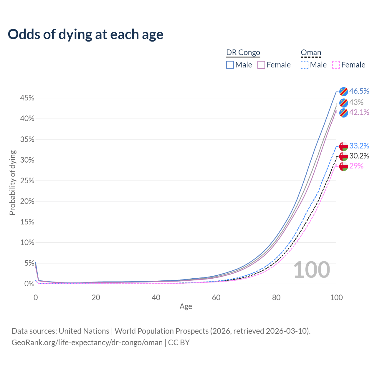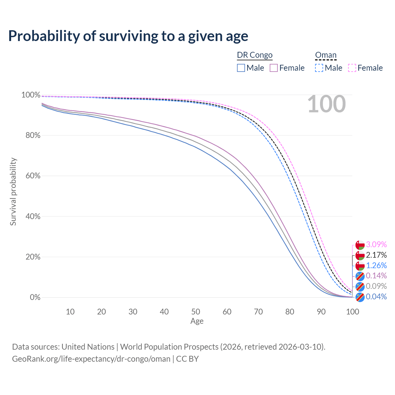 This life expectancy calculator shows the odds of living to 100, 95, 90, and below based on current age for both males and females in the DR Congo and Oman, along with mean and median age of death. The calculations are based on the 2026 life tables (actuarial tables) from the UN World Population Prospects.