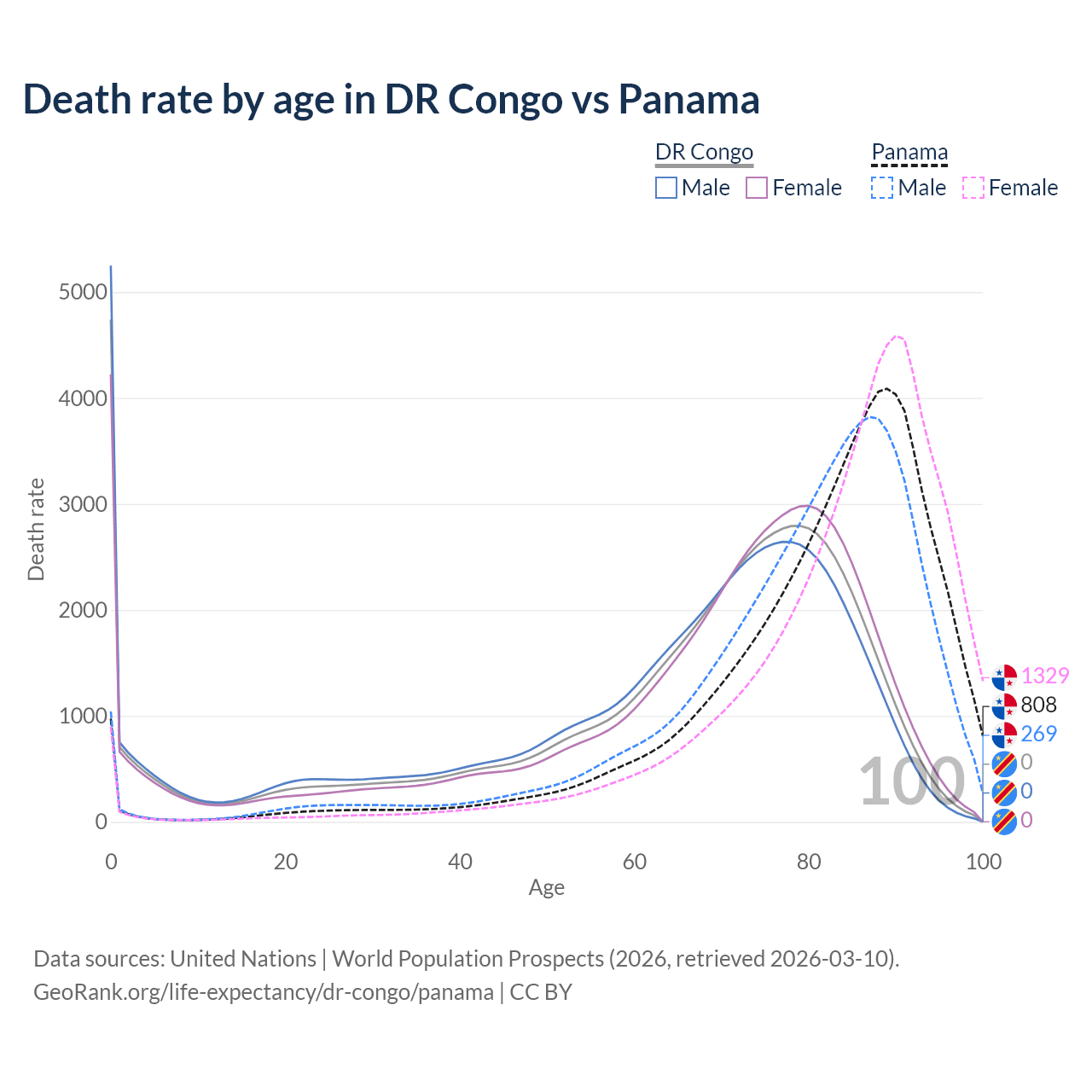 In the DR Congo, the most common age of death is 0, compared to 89 in Panama. The median age of death is 70.9 in the DR Congo and 84.6 in Panama, meaning only half of each cohort is expected to live past that age.