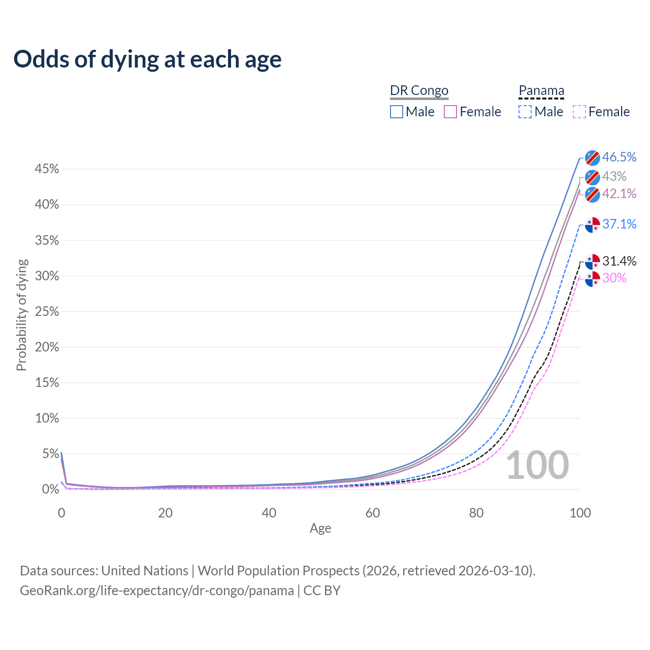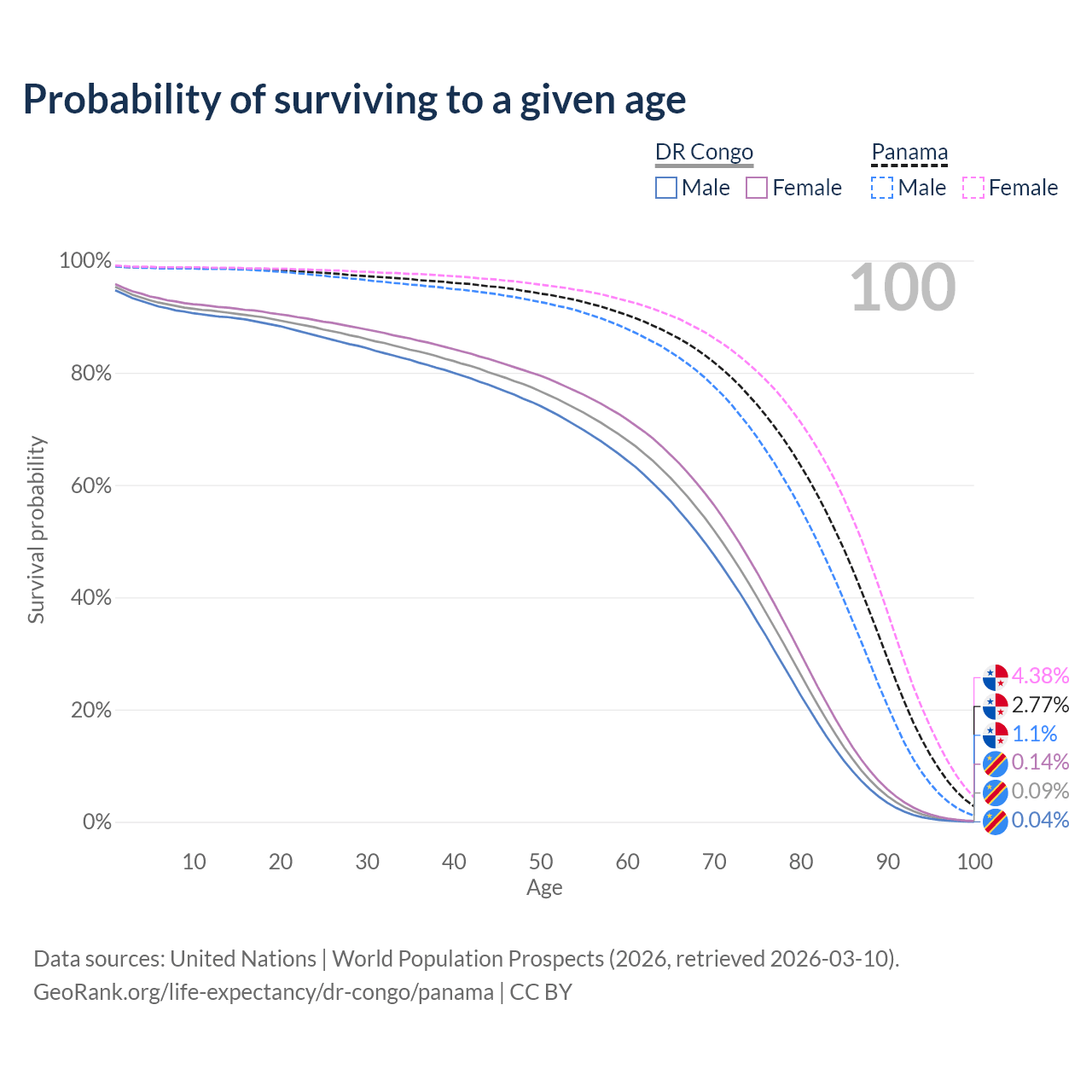 This life expectancy calculator shows the odds of living to 100, 95, 90, and below based on current age for both males and females in the DR Congo and Panama, along with mean and median age of death. The calculations are based on the 2026 life tables (actuarial tables) from the UN World Population Prospects.