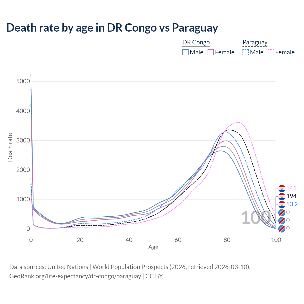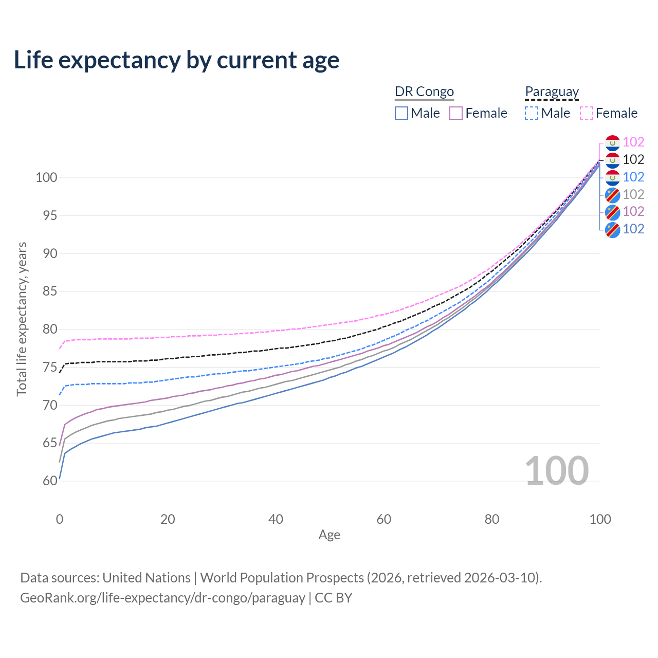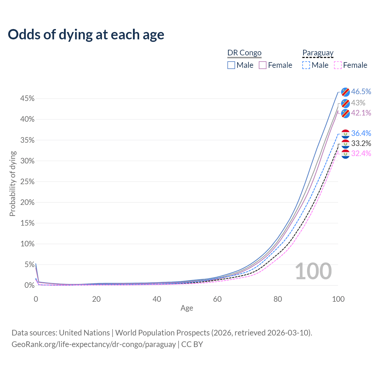 This life expectancy calculator shows the odds of living to 100, 95, 90, and below based on current age for both males and females in the DR Congo and Paraguay, along with mean and median age of death. The calculations are based on the 2026 life tables (actuarial tables) from the UN World Population Prospects.