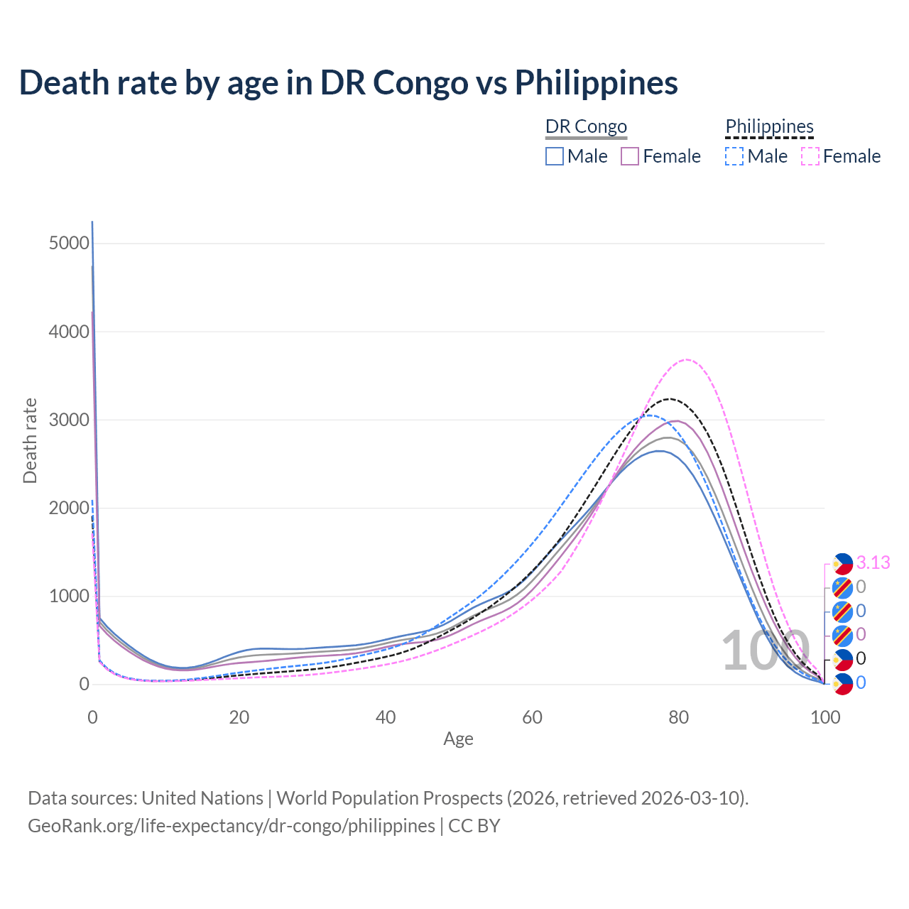 In the DR Congo, the most common age of death is 0, compared to 79 in the Philippines. The median age of death is 70.9 in the DR Congo and 74.6 in the Philippines, meaning only half of each cohort is expected to live past that age.