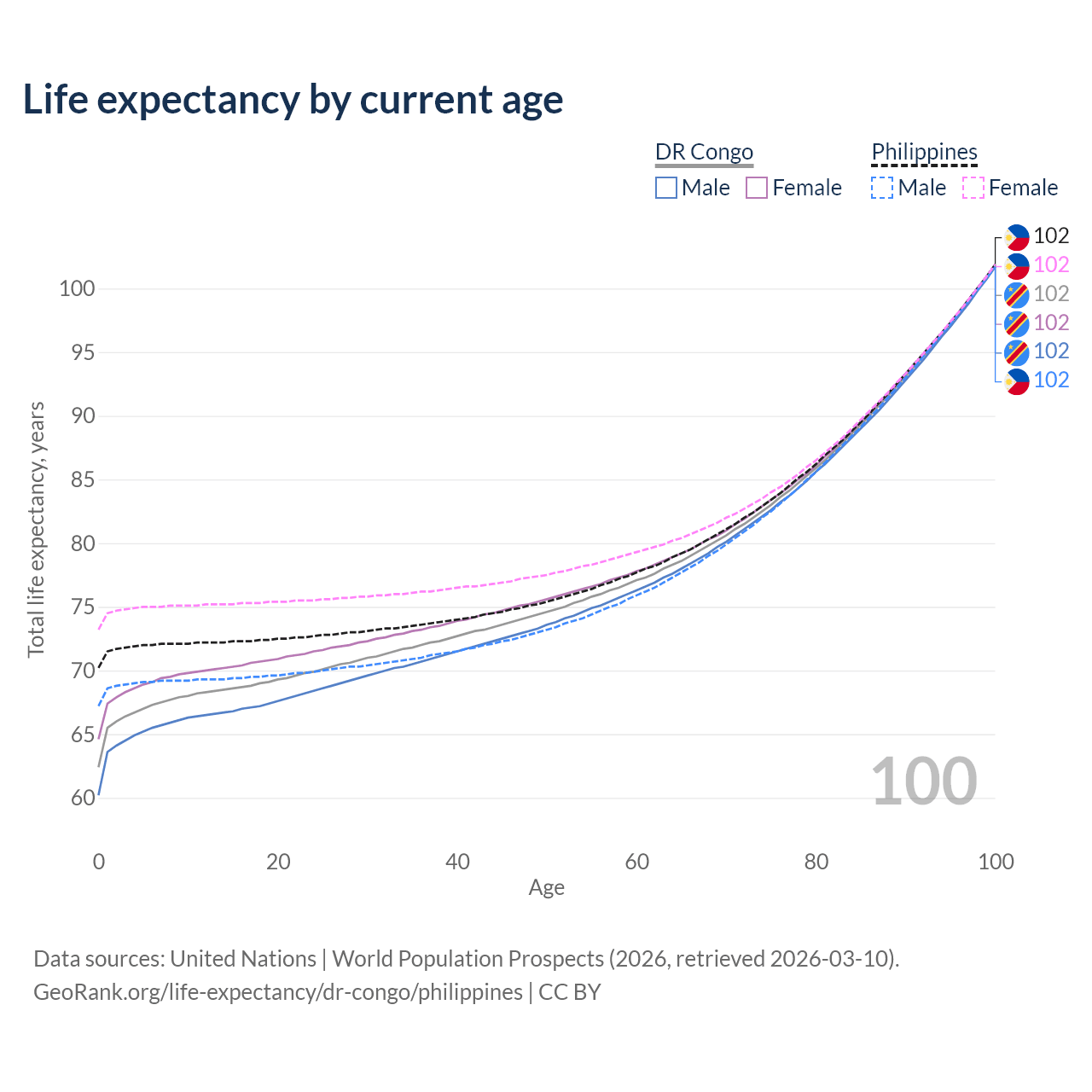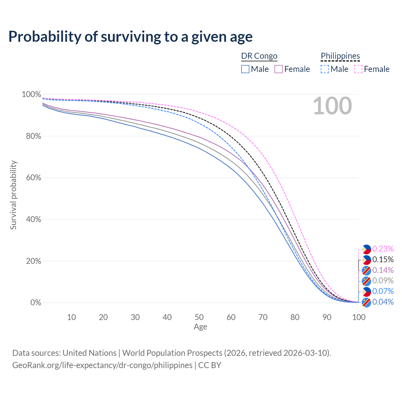 This life expectancy calculator shows the odds of living to 100, 95, 90, and below based on current age for both males and females in the DR Congo and the Philippines, along with mean and median age of death. The calculations are based on the 2026 life tables (actuarial tables) from the UN World Population Prospects.