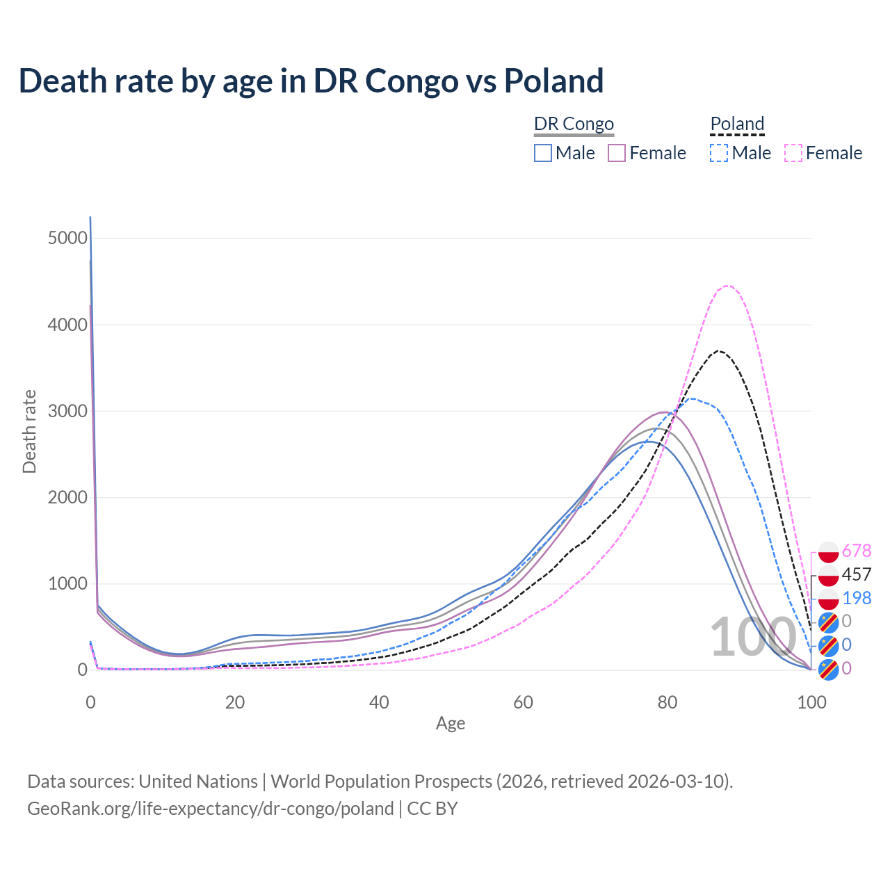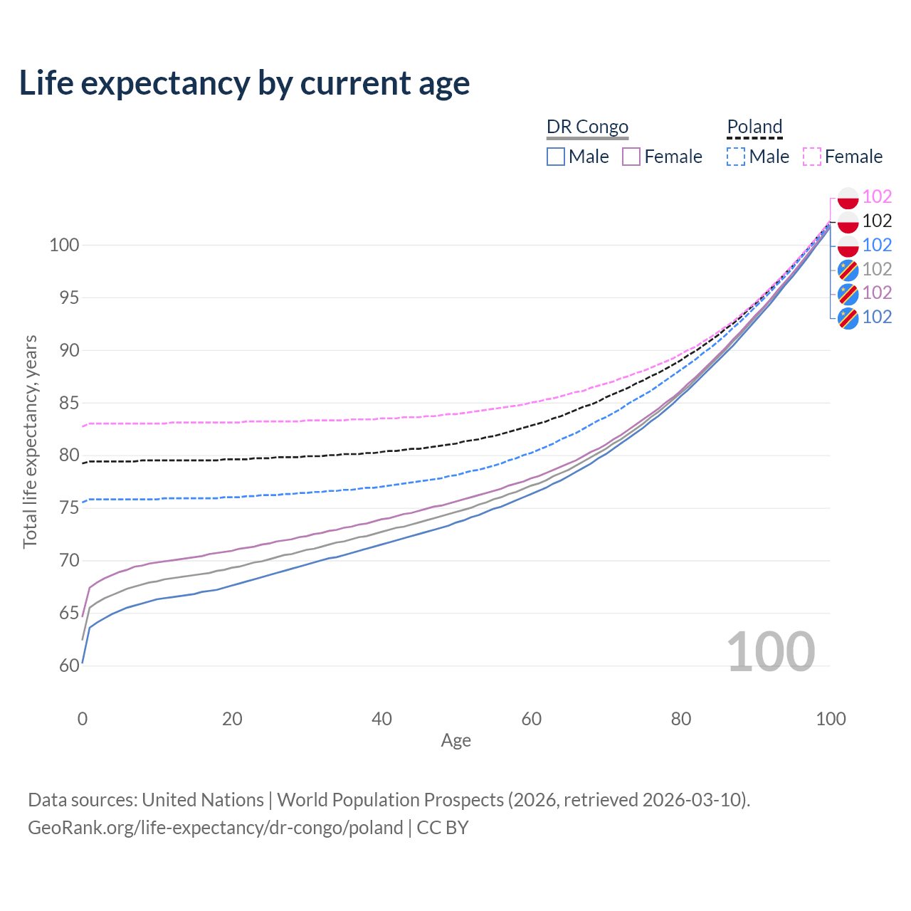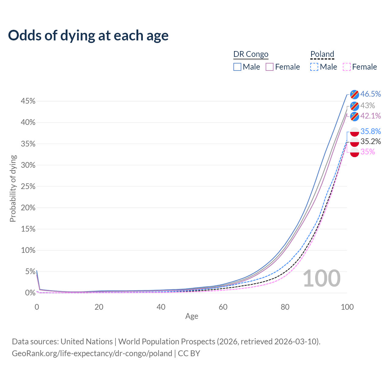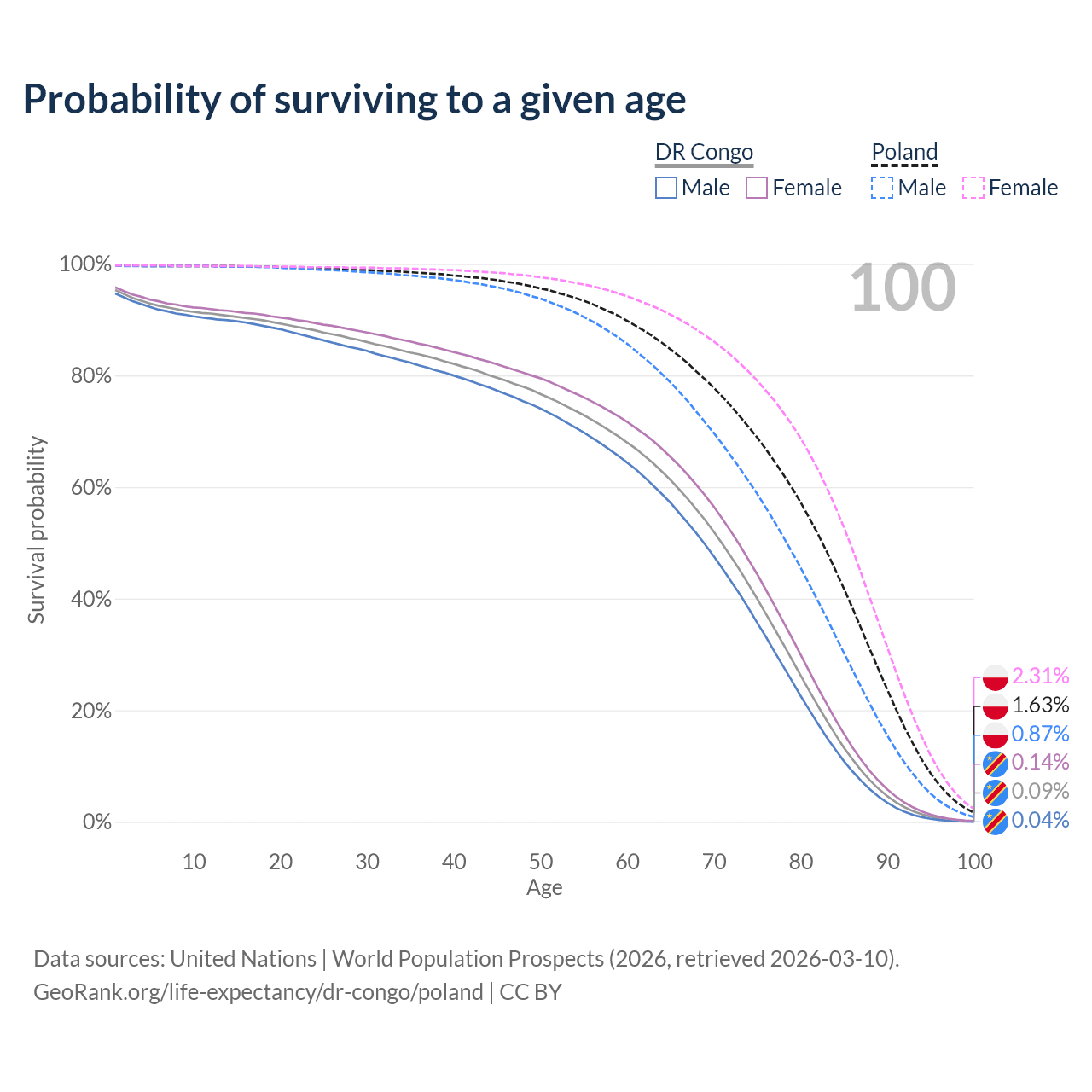 This life expectancy calculator shows the odds of living to 100, 95, 90, and below based on current age for both males and females in the DR Congo and Poland, along with mean and median age of death. The calculations are based on the 2026 life tables (actuarial tables) from the UN World Population Prospects.
