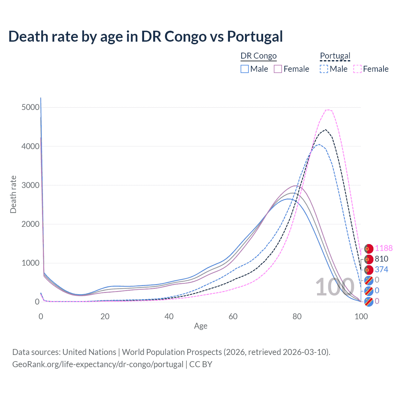 In the DR Congo, the most common age of death is 0, compared to 89 in Portugal. The median age of death is 70.9 in the DR Congo and 85.9 in Portugal, meaning only half of each cohort is expected to live past that age.