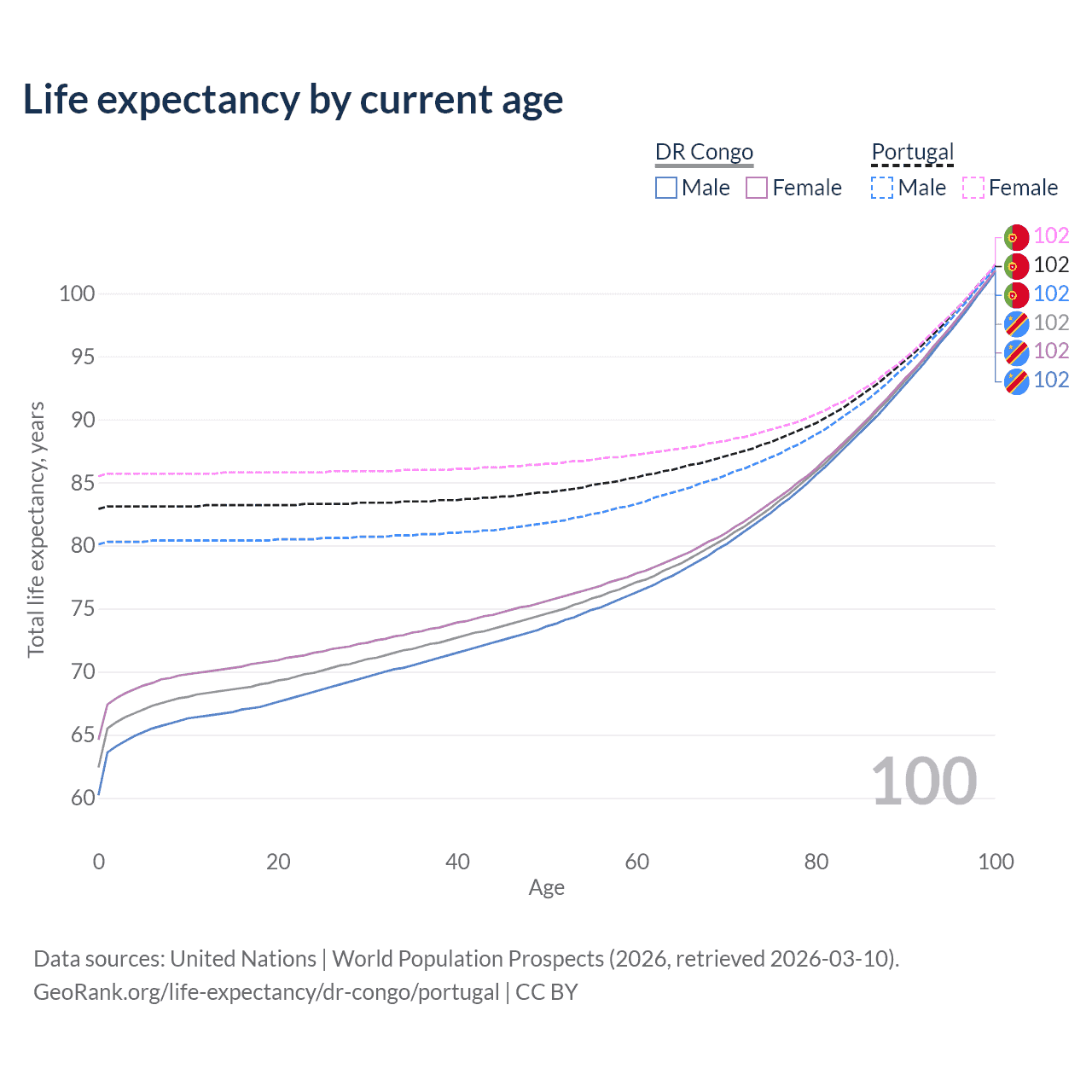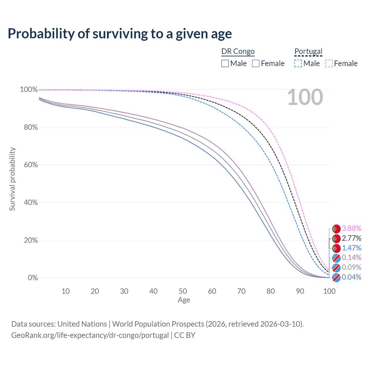 This life expectancy calculator shows the odds of living to 100, 95, 90, and below based on current age for both males and females in the DR Congo and Portugal, along with mean and median age of death. The calculations are based on the 2026 life tables (actuarial tables) from the UN World Population Prospects.